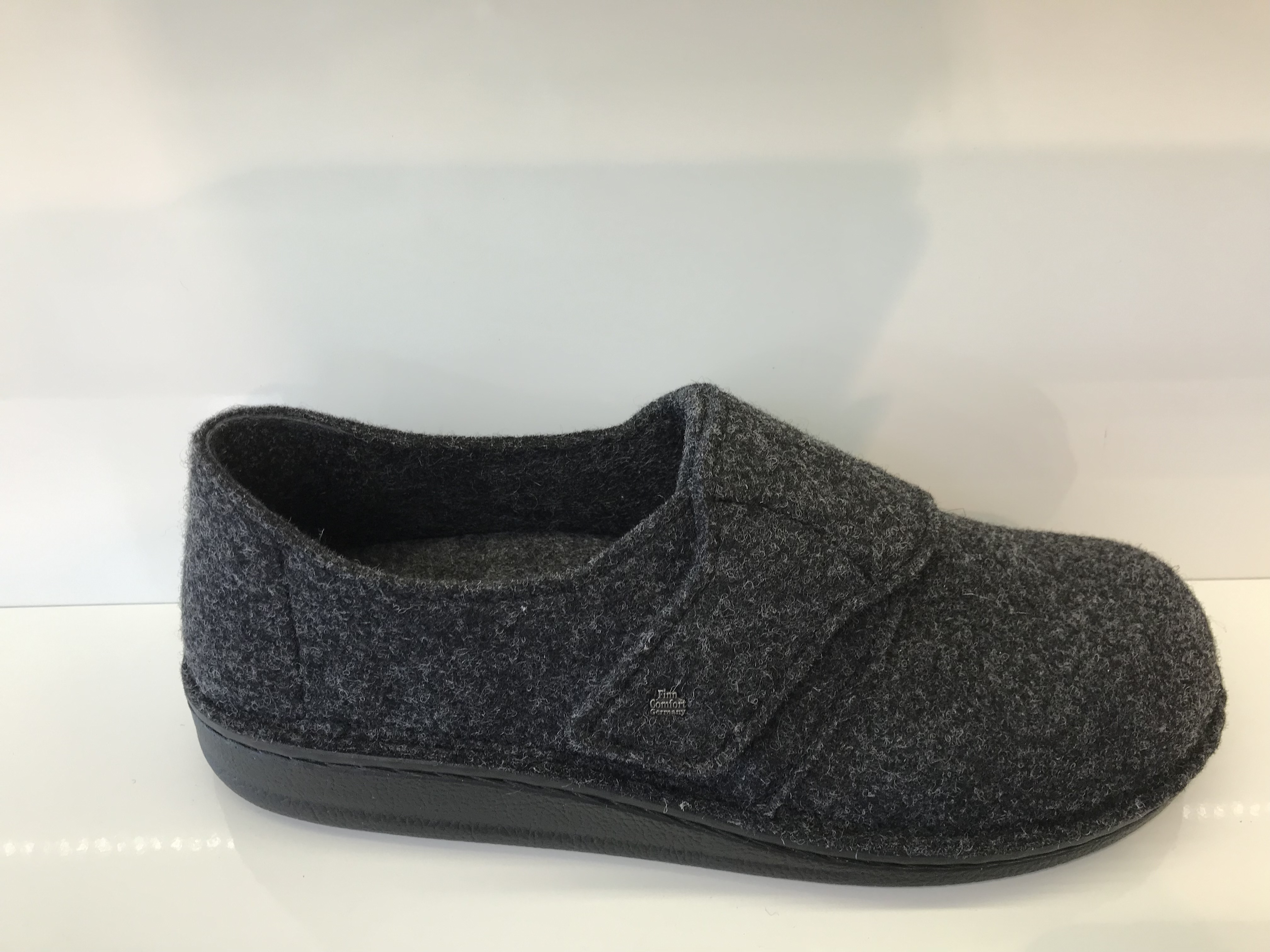 Herrenhausschuhe von Finn Comfort; Obermaterial: Filzmaterial; Innenmaterial: Filzfutter aus 100% Schurwolle; herausnehmbares anatoisch geformtes Fußbett; verstellbar durch einen Klettverschluss; geschlossene Herrenhausschuhe; Weite D; Farbe Anthrazit