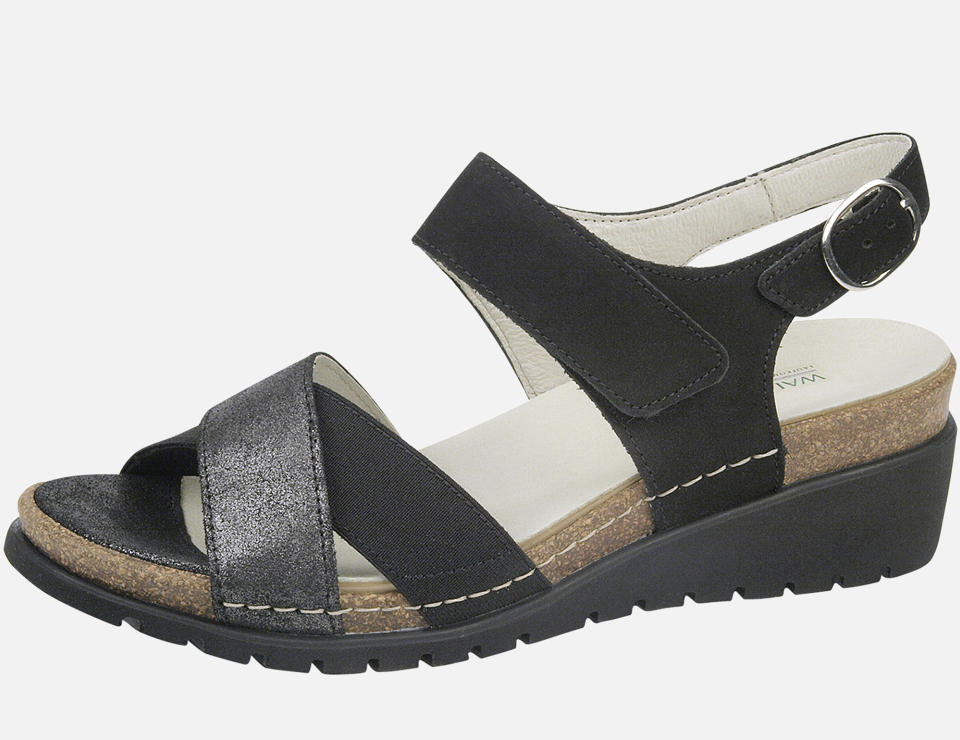 Obermaterial: Nubukleder und Textilmaterial; Innenmaterial: Leder; herausnehmbares Fußbett mit Befestigung durch Klettverschluss; verstellbar durch ein Klett und Fersenriemen mit Dornenschnalle; Weite H; mit Keilabsatz; Absatzhöhe: 2,5 cm; Farbe: Schwarz
