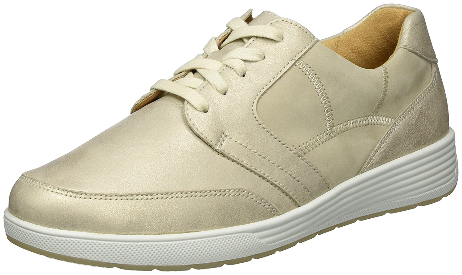 Obermaterial: Nubuk- und Velourleder; Innenmaterial: Lederfutter; herausnehmbares Leicht-Korkfußbett; verstellbar durch Schnürung; dämpfende PU-Laufsohle mit Rutschhemmendem TPU-Lauffläche; Absatzhöhe ca. 1,5 cm; geeignet für empfindliche Fußfüße (Weiches Innenfutter, wenig Innennähte und mit viel Platz für die Zehen) für Diabetiker gut geeignet; Weite K; Farbe: Creme
