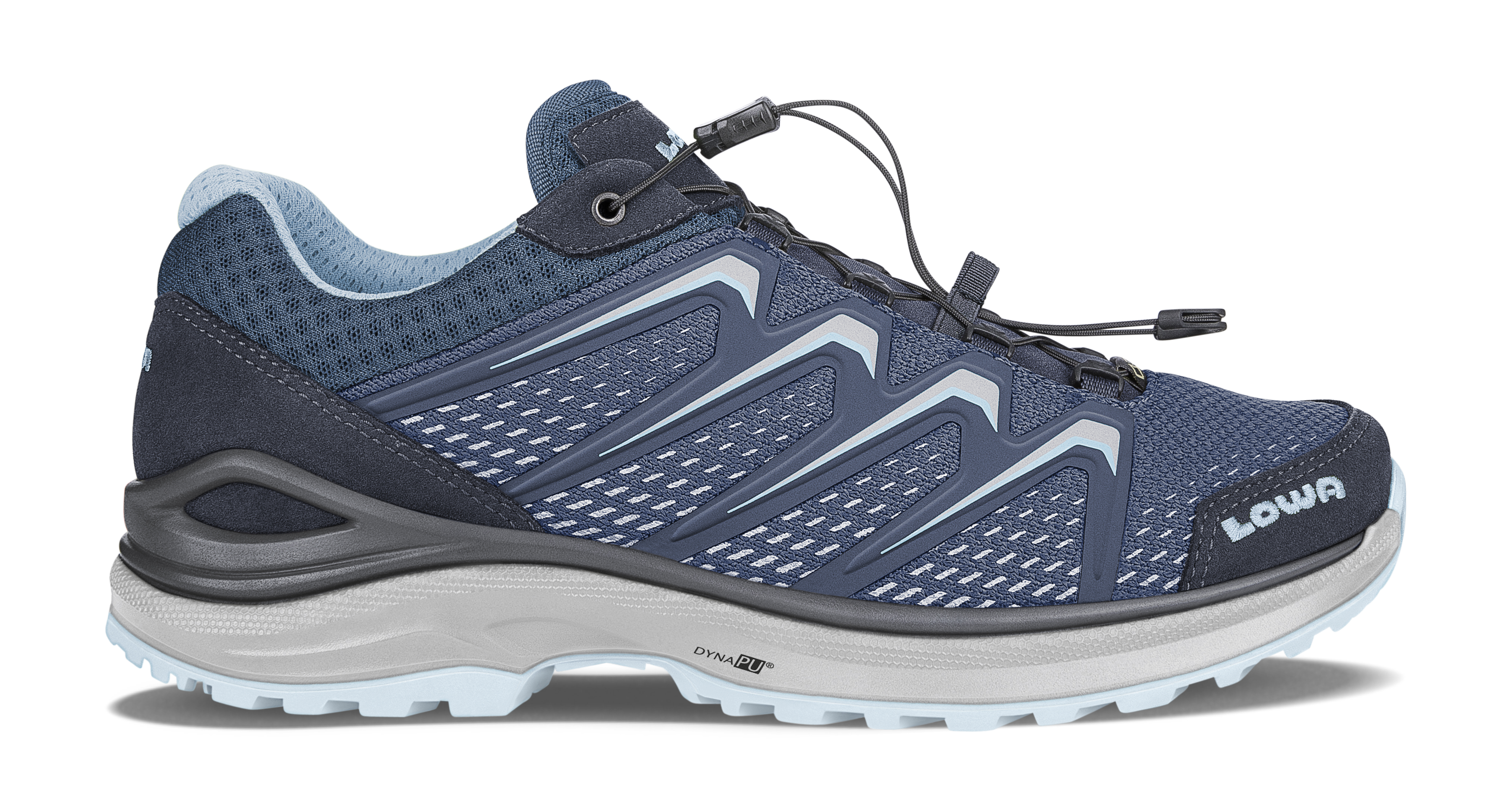 Damenhalbschuhe von Lowa; Obermaterial: Textil- und Synthetikmaterial; Innenmaterial: Textilfutter; herausnehmbarem Fußbett; atmungsaktiv und wasserabweisend durch Gore-Tex; Sohle: Lowa Enduro Evo, ist sehr weich; abriebfeste Gummimischung; Verstellbar durch Speed-Lace-Technologie (einem Zipperverschluss); Weite: für normale Füße; Farbe: Navy/Eisblau
