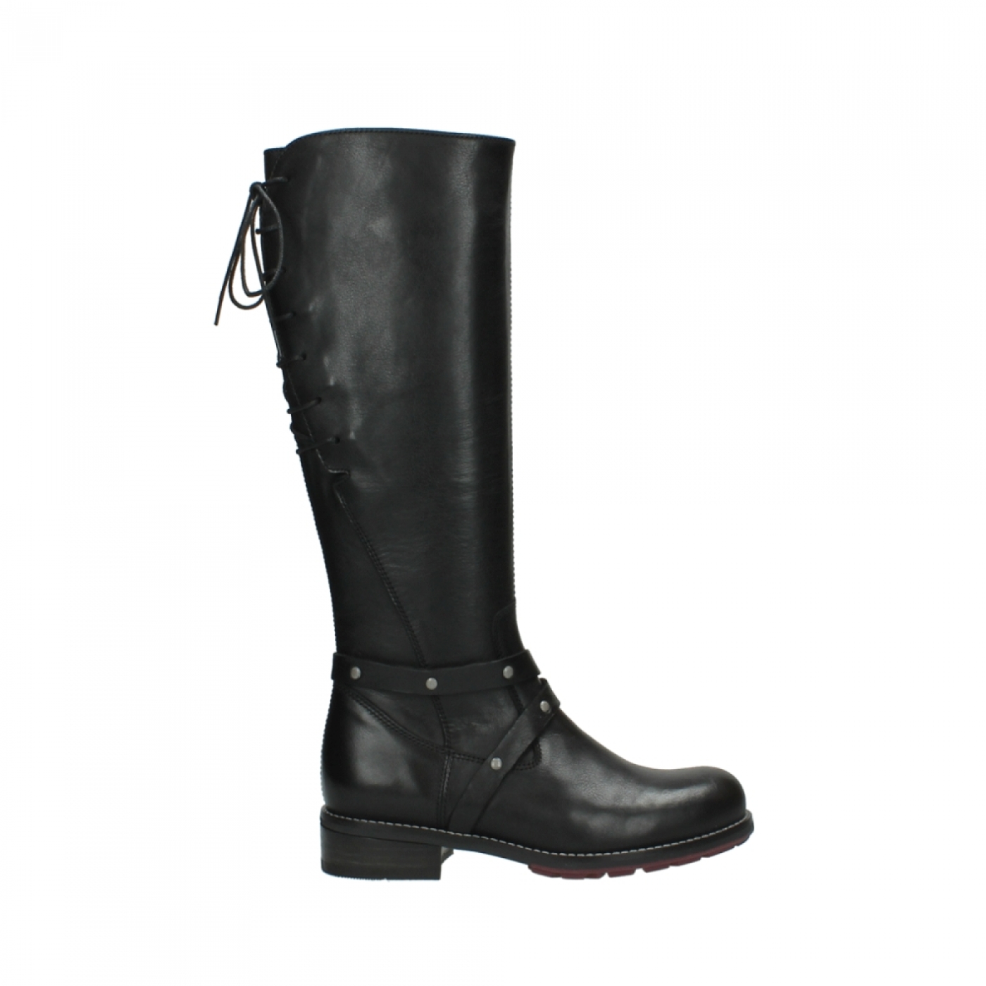 Obermaterial: gebürstetes Rindleder; Innenmaterial: Schweinsleder; herausnehmbares Fußbett, somit auch für eigene Einlagen geeignet; Bequemes An- und Ausziehen durch Reißverschlüssen an den Innenseiten; Schnürung verläuft zur Rückseite des Stiefelschaffts; Riemen um den Schuh als modisches Detail; Mittlere bis weitere Breite; Lederbezogener Absatz; Absatzhöhe: 2,5cm; Schafthöhe 38cm; Farbe: Schwarz.