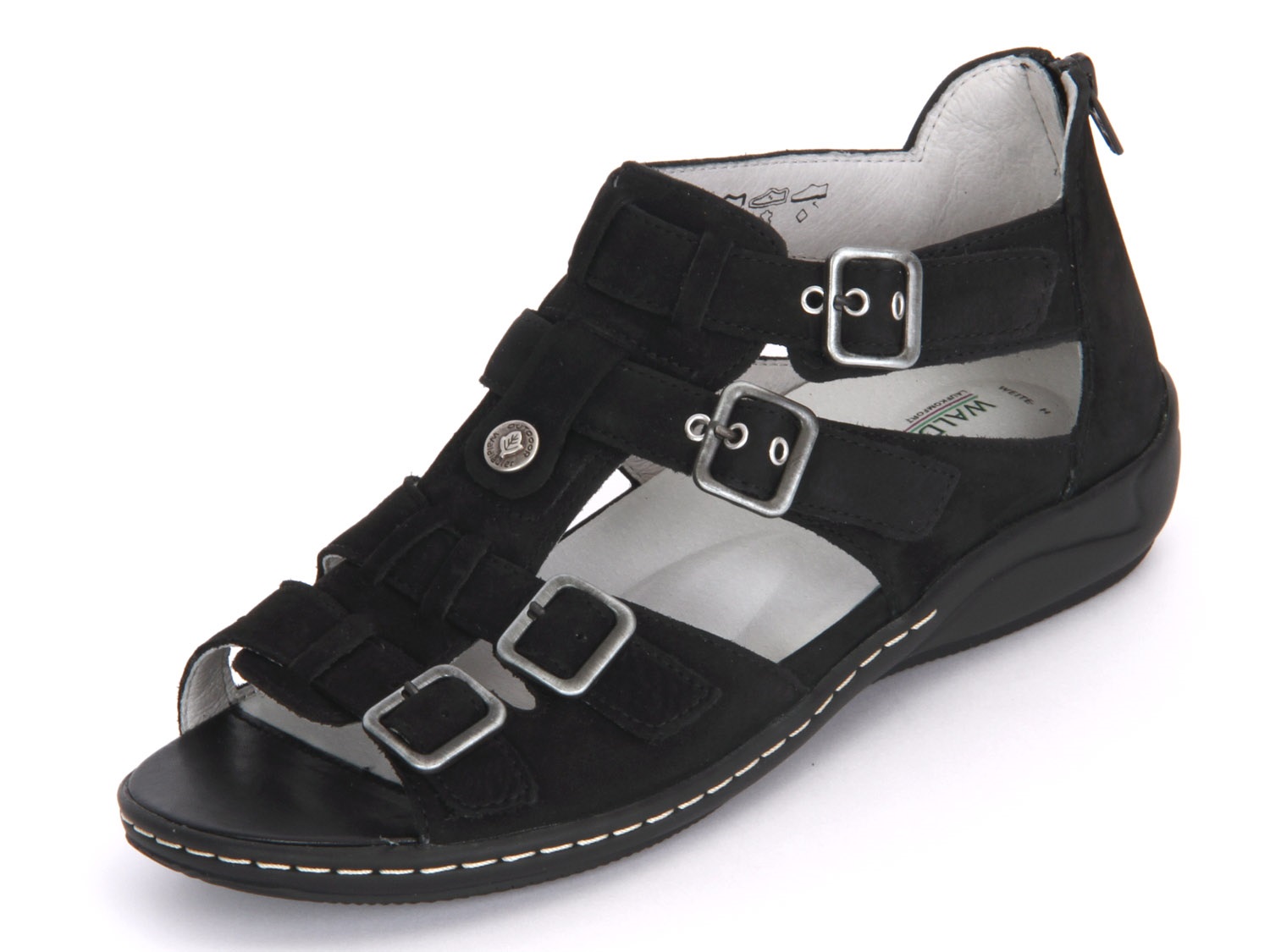 Obermaterial: Nubukleder; Innenmaterial: Lederfutter; herausnehmbares Fußbett; verstellbar durch vier Dornenschnallen; die oberen zwei Riemen haben zusätzlich einen Klettverschluss; an der Ferse ist noch ein zusätzlicher Reißverschluss; geschlossene Ferse; Weite H; Farbe: Glitter/ Nero (Schwarz)