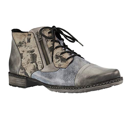 Obermaterial: Glattleder und geprägtes Leder; Innenmaterial: Lodenfutter; herausnehmbares Fußbett; verstellbar durch Schnürung und einem Reißverschluss auf der Innenseite; kleiner Absatz; Absatzhöhe ca. 1,5cm; mit Zierreißverschluss; Farbe: Ozean ( Blau/Grau)