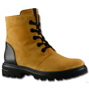 Damenboots / Obermaterial: Nubukleder und Glattleder; Innenmaterial: leichtes Filzfutter; herausnehmbares Leichtkorkfußbett; verstellbar duch Schnürung und einem Reißverschluss an der Innenseite; Sohle mit einem guten Profil; Weite H; Farbe: Curry (Gelb)