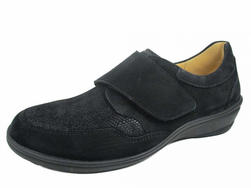Obermaterial: Softnubukleder und Strechmaterial; Innenmaterial: Sensitiv-Lederfutter; herausnehmbares anatomisch geformtes Leichtkorkfußbett; verstellbar durch einen Klettverschluss; stoßdämpfende 4-Punkt Sohle sorgt für ein natürliches Barfußähnliches Gehvergnügen; dämpfender Auftritt; leicht profilierte rutschhemmende Sohle; gut geeignet für Diabetiker und für empfindliche Füße; Dunkle Sohle; Weite H; Farbe: Schwarz