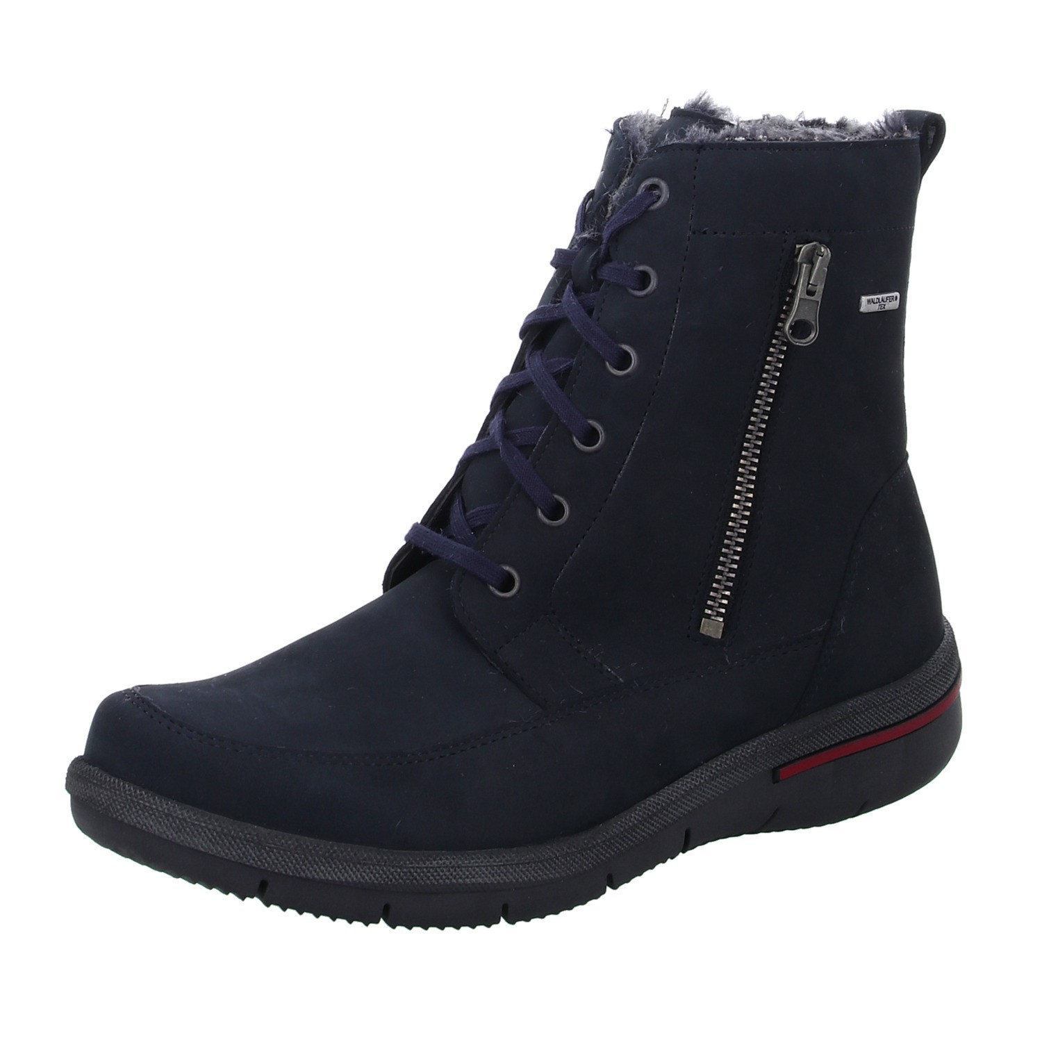 Obermaterial: Nubukleder; Innenmaterial: Warmfutter (Fellfutter); herausnehmbares Fußbett; wasserabweisend durch Waldläufer-Tex; verstellbar durch Schnürung und einem seitlichen Reißverschluss auf der Innenseite; Weite H; Dunkle Sohle; Knöchelhoch; Farbe: Notte (Dunkelblau)