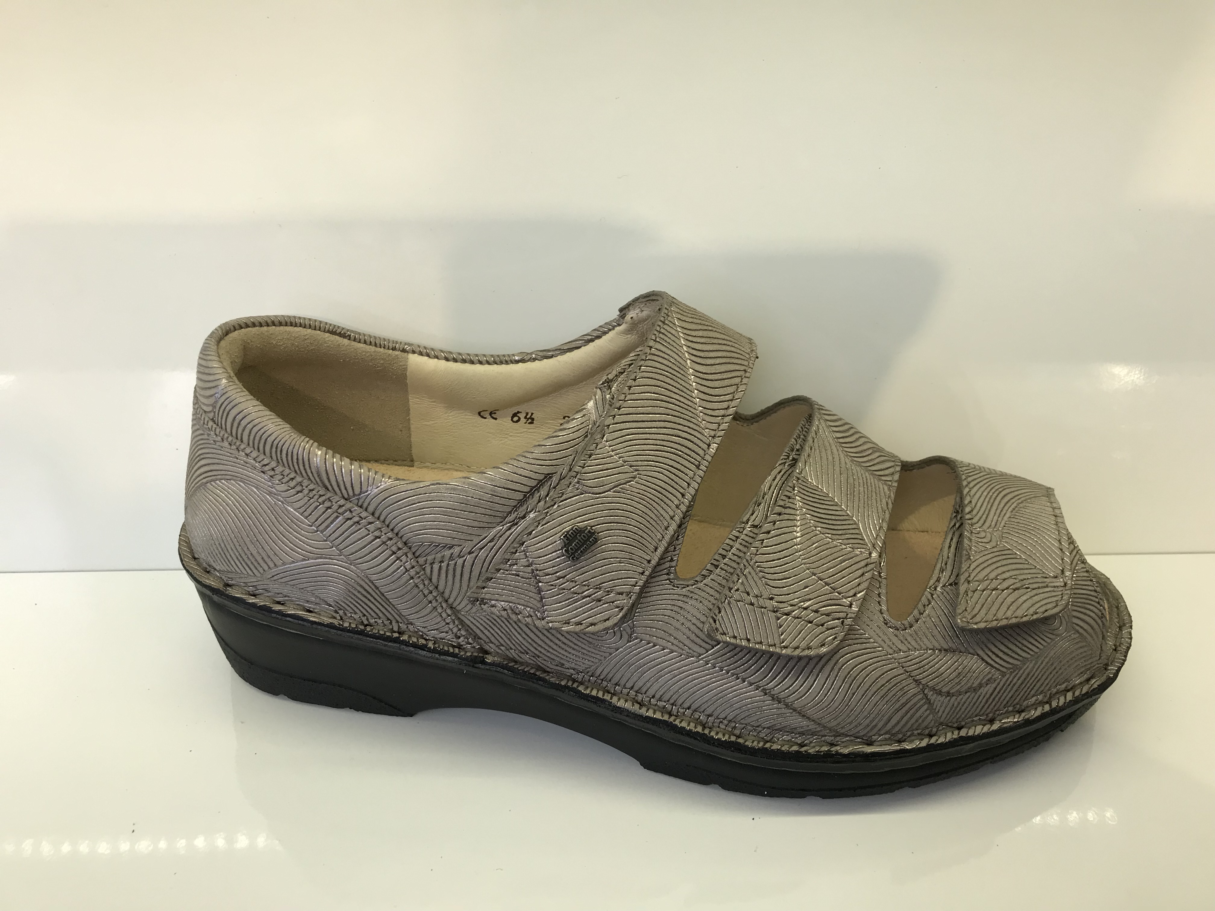 Damensandale von Finn Comfort; Obermaterial: geprägtes Glattleder; Innenmaterial: Lederfutter; herausnehmbares Korkfußbett; verstellbar durch drei Klettverschlüsse; geschlossene Ferse; gelenkschonend durch die stoßdämpfende PU-Laufsohle; Weite D; Farbe: Sand/Storm