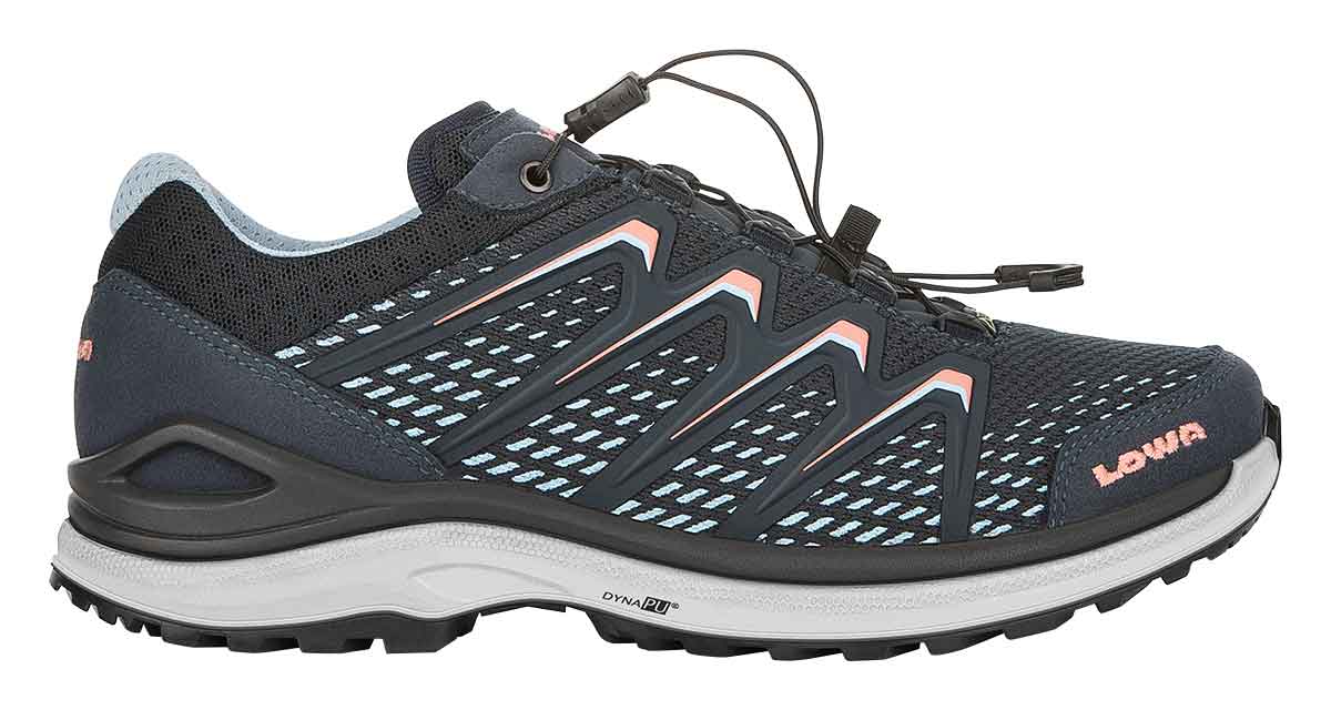 Damenhalbschuhe von Lowa; Obermaterial: Textil- und Synthetikmaterial; Innenmaterial: Textilfutter; herausnehmbarem Fußbett; atmungsaktiv und wasserabweisend durch Gore-Tex; Sohle: Lowa Enduro Evo, ist sehr weich; abriebfeste Gummimischung; Verstellbar durch Speed-Lace-Technologie (einem Zipperverschluss); Weite: für normale Füße; Farbe: Stahlblau/ Lachs