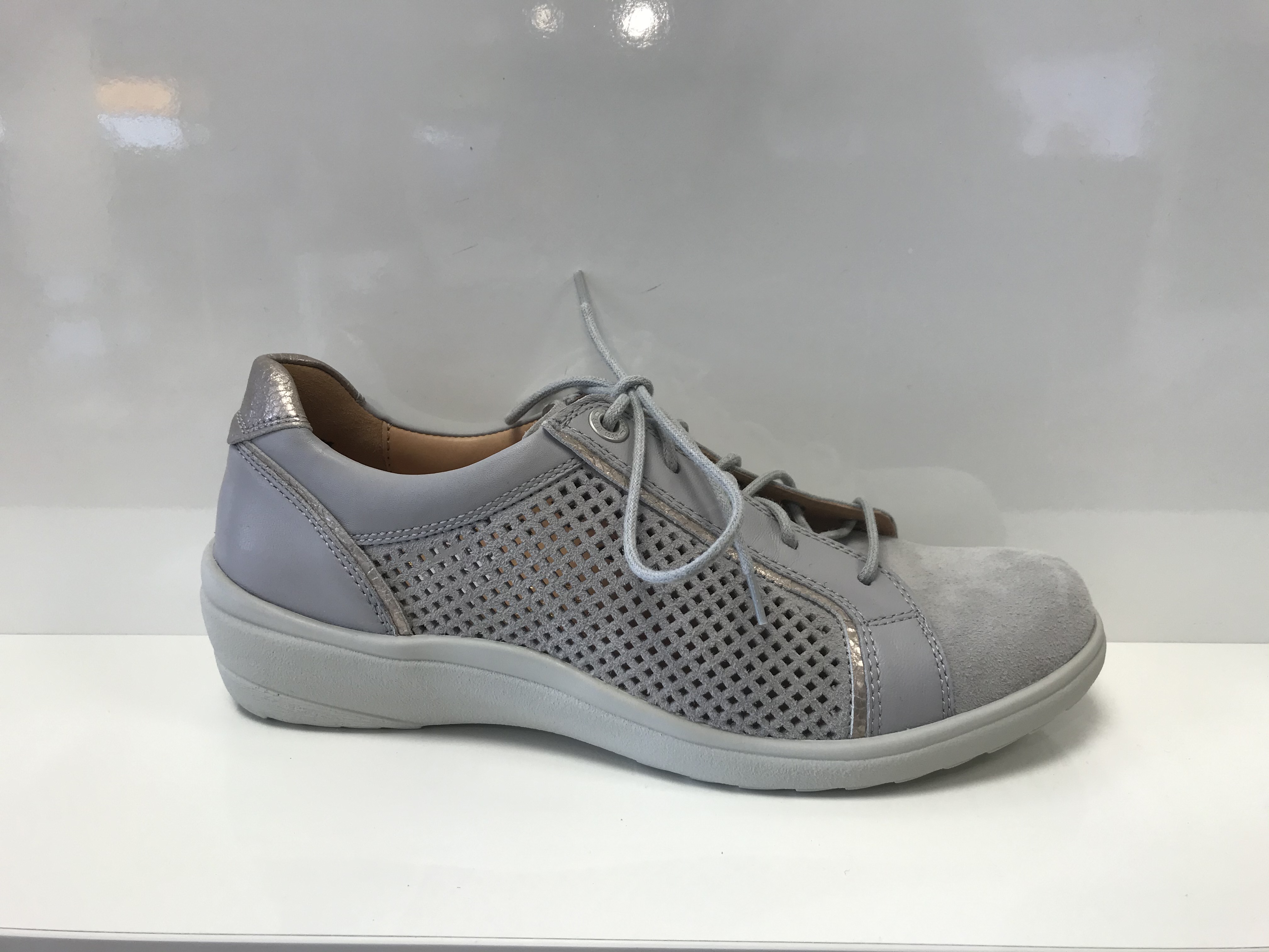 Damenhalbschuh; Obermaterial: Velourleder / Glattleder; Innenmaterial: Leder; Sohle: Stoßdämpfend; an den Seiten ist das Leder gelocht; herausnehmbares Fußbett; verstellbar durch Schnürung; atmungsaktives und elastisches Leder; Weite H; Farbe: Hellgrau
