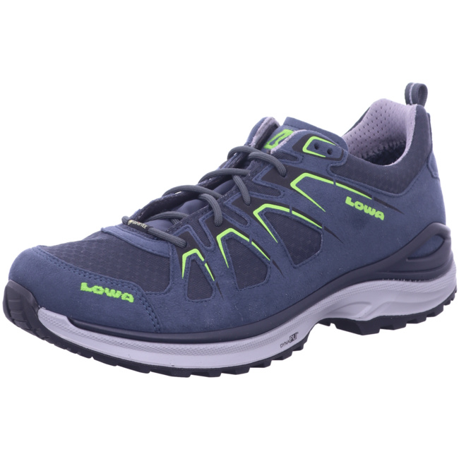 Herrenwanderschuhe von Lowa; Obermaterial: Textil- und Microfasermaterial; Innenmaterial: Textilfutter; herausnehmbares Fußbett; Wasserdicht und atmungsaktiv durch Gore-Tex; verstellbar durch Schürung; Sohle: LOWA Enduro Evo; abriebfeste Gummimischung für einen perfekten Grip; Weite: für normale Füße; Farbe: Stahlblau/ Limone
