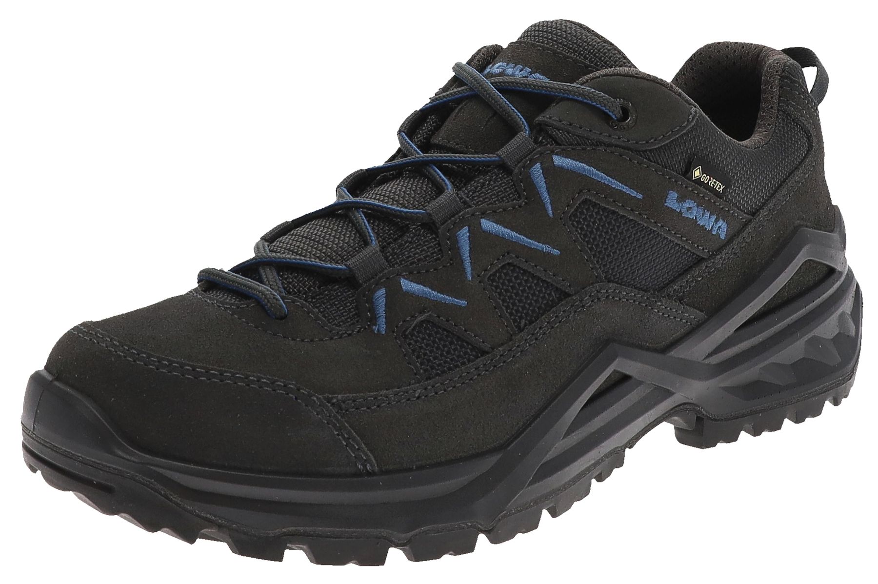 Obermaterial: Velourleder und Textilmaterial; Innenmaterial: Textilfutter; herausnehmbarem Fußbett; atmungsaktiv und wasserabweisend durch Gore-Tex; Sohle: Lowa Cross III; hiking-orientiertes Profil für eine sehr gute Haftung und Traktion auf vielen Untergründen; Verstellbar durch Schnürung; Farbe: Graphit/Blau