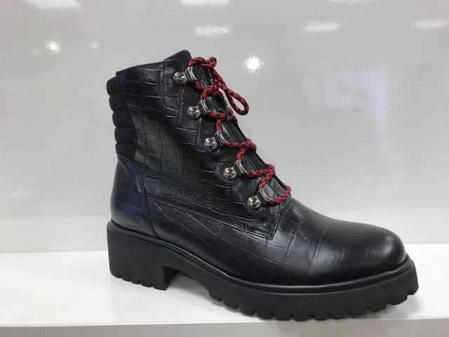 Damenstiefel, Obermaterial: Glattleder mit Muster, Innenmaterial: leicht gefüttert, Profilsohle, herausnehmbares Fußbett, Verstellbar durch Schnürung, Reißverschluss, Weite H, Farbe: Schwarz mit rot/schwarzen Schnürrsenkel