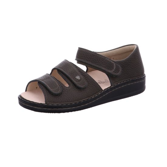 Herrensandale von Finn Comfort; Obermaterial: Nubukleder; Innenmaterial: Lederfutter; herausnehmbares anatomisch, geformtes Fußbett und ein zusätzliches Reflexzonenfußbett; verstellbar durch drei Klettverschlüsse; geschlossene Ferse; Absatzsprengung mit 12 mm; Softsohle; Weite D; Farbe: Ebony (Braun)