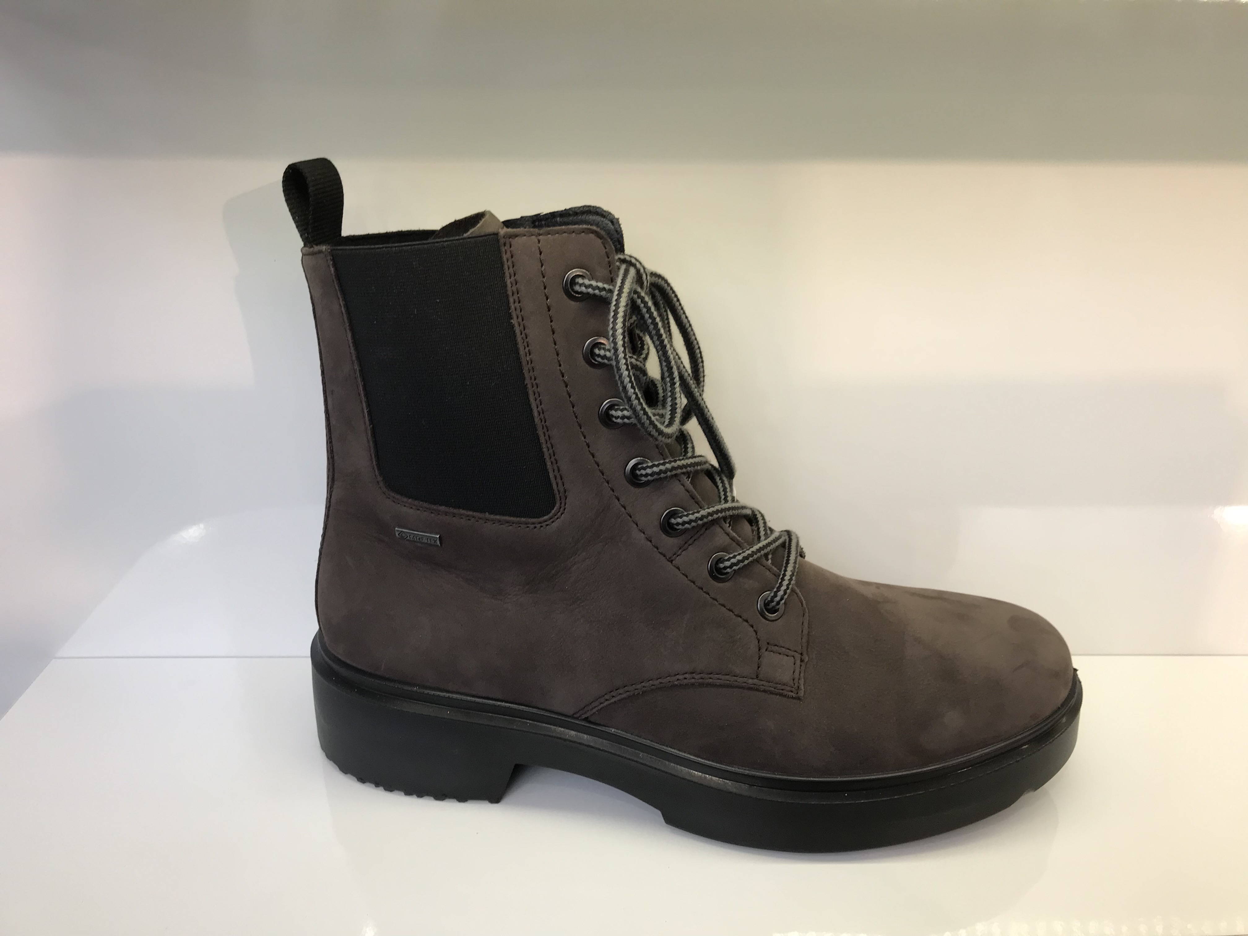 Damenstiefel von Legero; Obermaterial: Nubukleder mit Gummizug; Innenmaterial: Lodenfutter; herausnehmbares Fußbett; verstellbar durch Schnürung und Reißverschluss auf der Innenseite; wasserabweisend und atmungsaktiv durch Gore-Tex; PU-Profillaufsohle; Sehr leicht; Weite G; Farbe. Ossido (Grau)