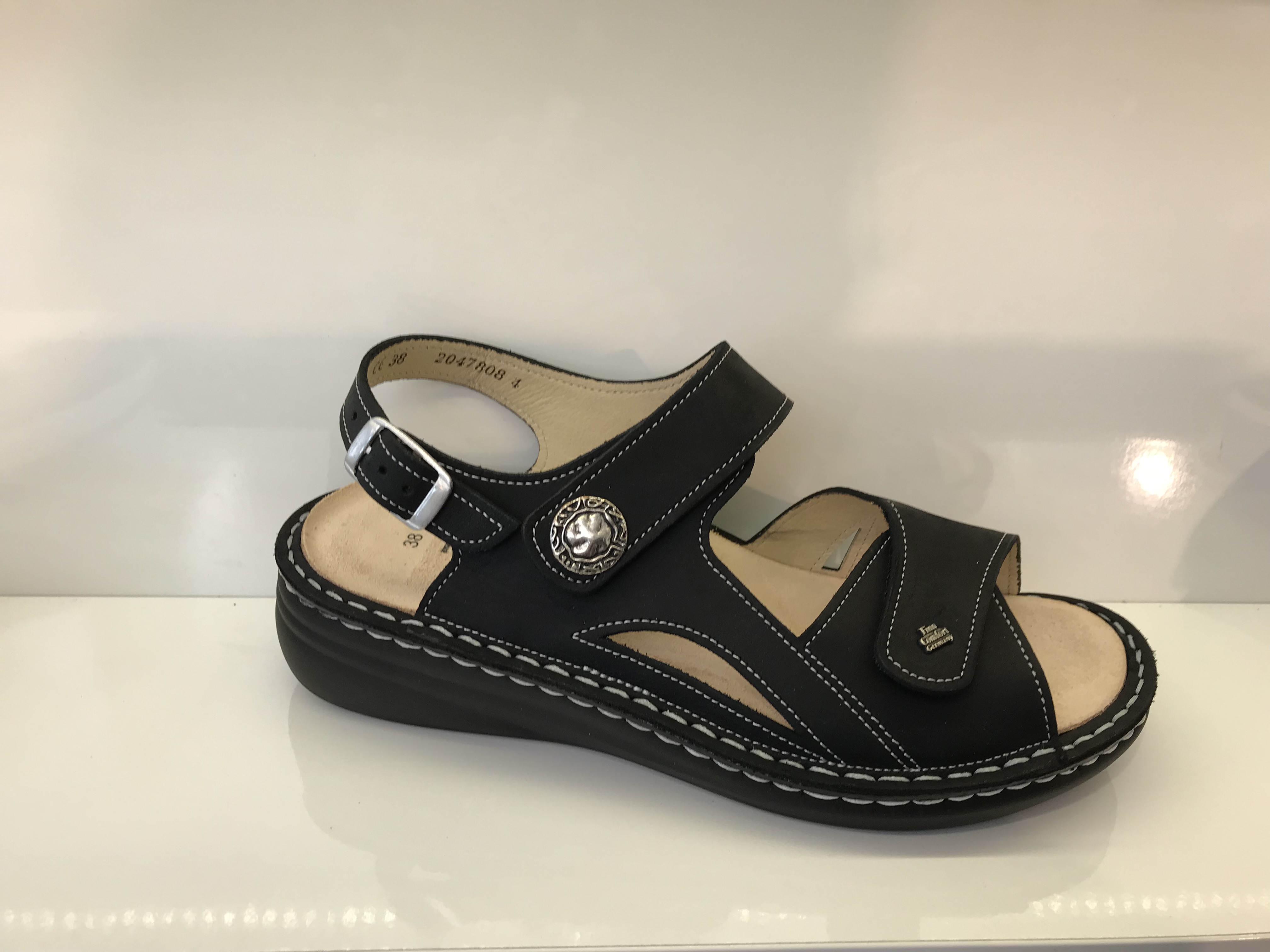 Damensandale von Finn Comfort; Obermaterial: Nubukleder; Innenmaterial: Lederfutter; herausnehmbares, anatomisch geformtes Super-Softkorkfußbett (Mellow); verstellbar durch zwei Klettverschlüsse und einem Fersenriemen; Schwarze Sohle; Absatzhöhe: ca. 2,5 cm; Weite D; Farbe: Schwarz
