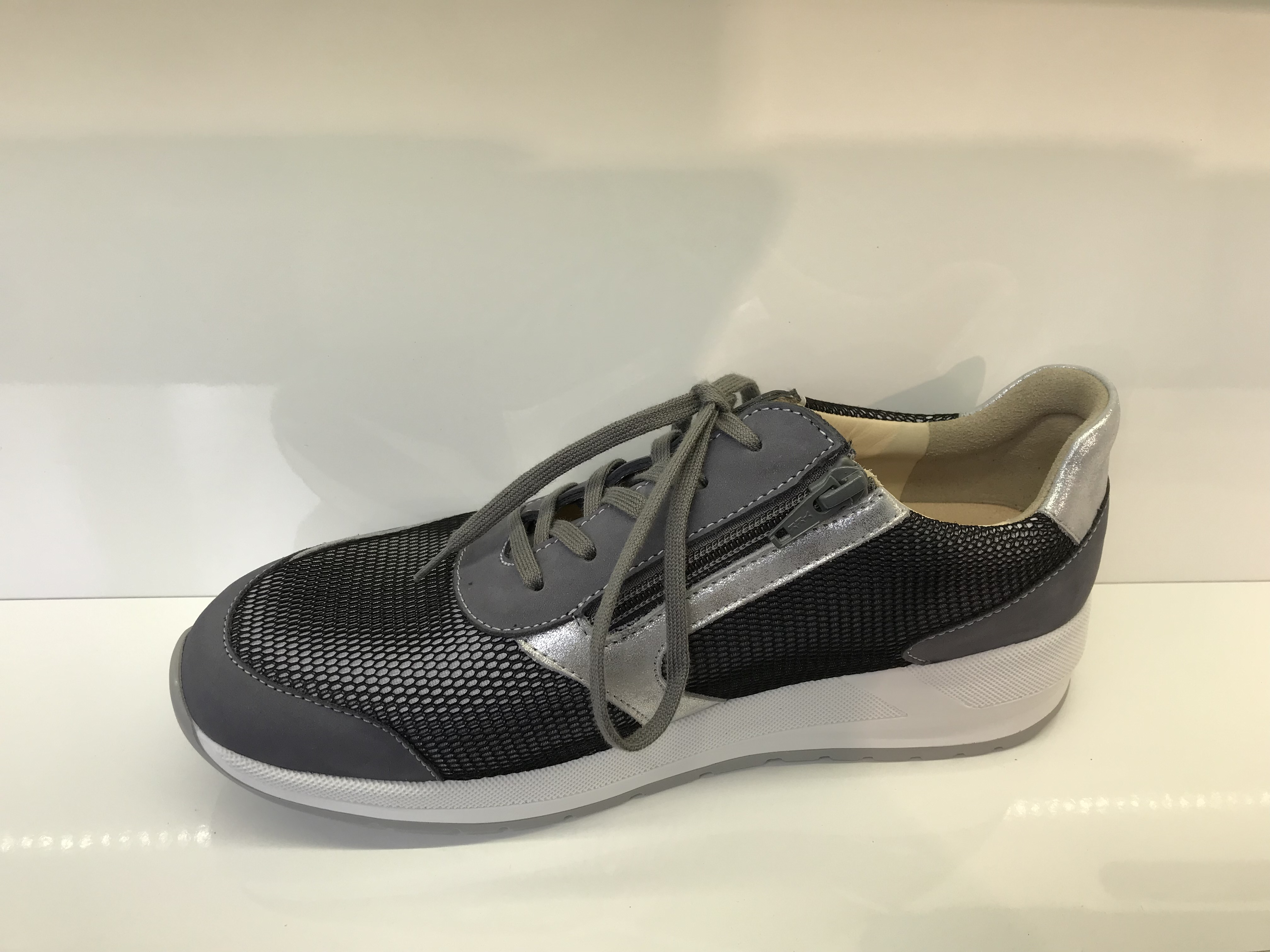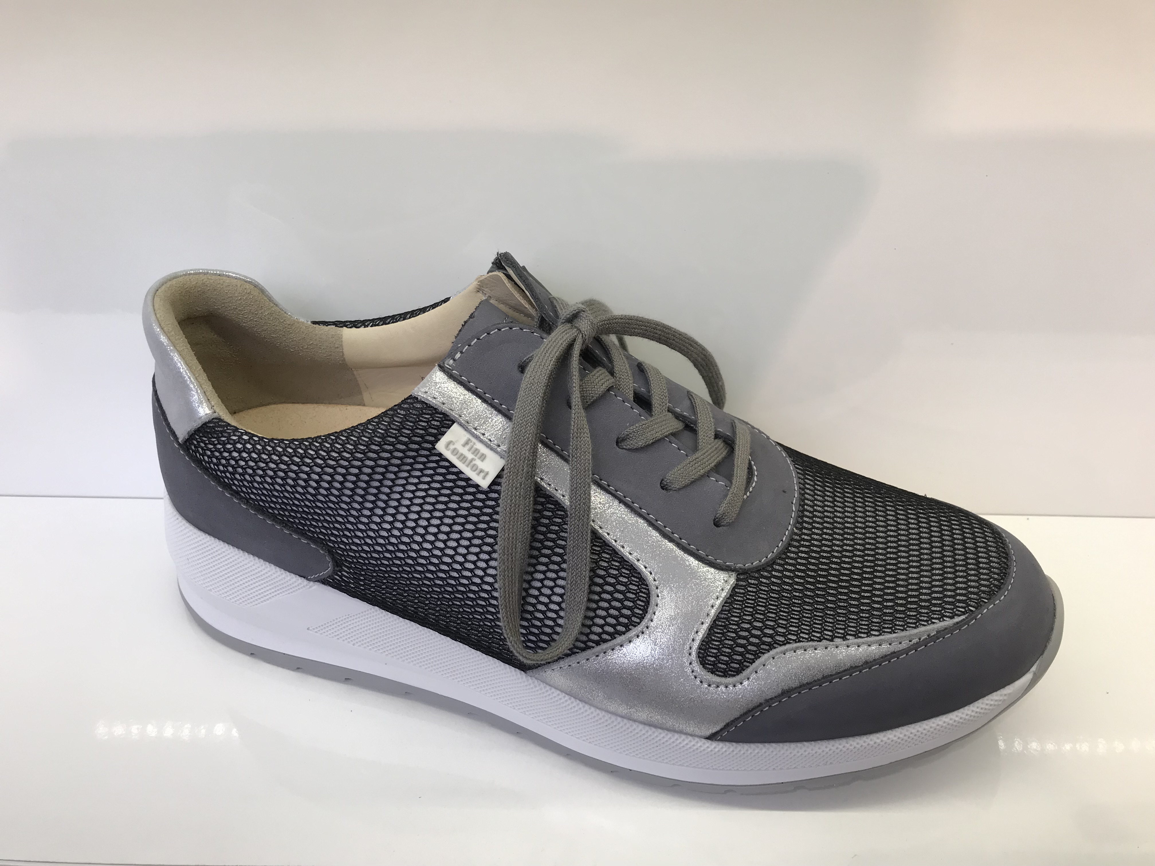 Damenhalbschuhe von Finn Comfort; Obermaterial: Nubukleder und Stechmaterial mit Mesh überzogen; Innenmaterial: Lederfutter; herausnehmbares Softfußbett; verstellbar durch Schnürung und einen Reißverschluss auf der Innenseite des Schuhs; Luftpolstersohle; Weite: D; Farbe: Grau-Silber