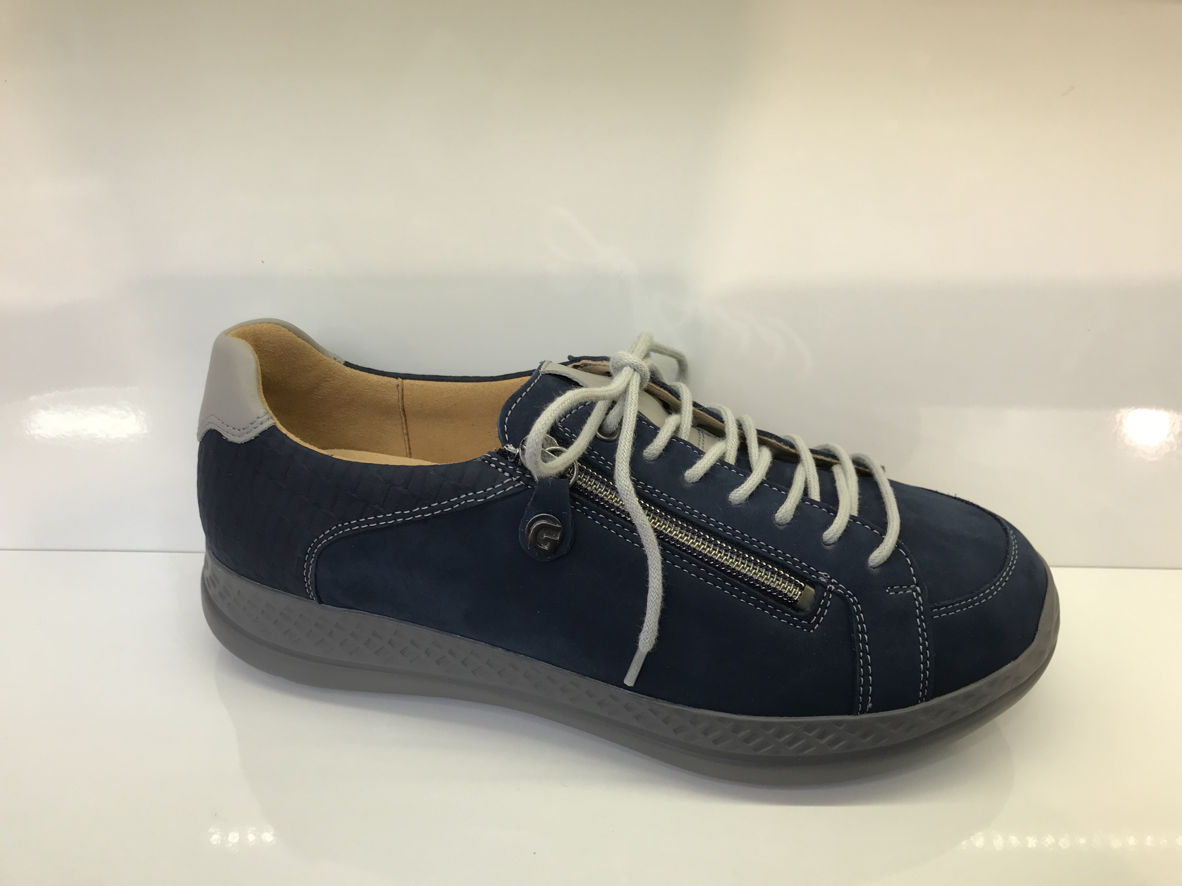 Damen-Diabetikerschuhe von Ganter; Obermaterial: Softnubukleder; Innenmateial: Sensitivlederfutter; herausnehmbares Leicht-Korkfußbett; verstellbar durch Schnürung und einem zusätzlichen Reißverschluss; dämpfende PU-Laufsohle; graue Sohle; Absatzhöhe ca. 2 cm; geeignet für empfindliche Fußfüße (Weiches Innenfutter, wenig Innennähte und mit viel Platz für die Zehen) für Diabetiker gut geeignet; Sehr weites Modell; Sohlenversteifung; Weite K-L; Farbe: Ink (Blau)