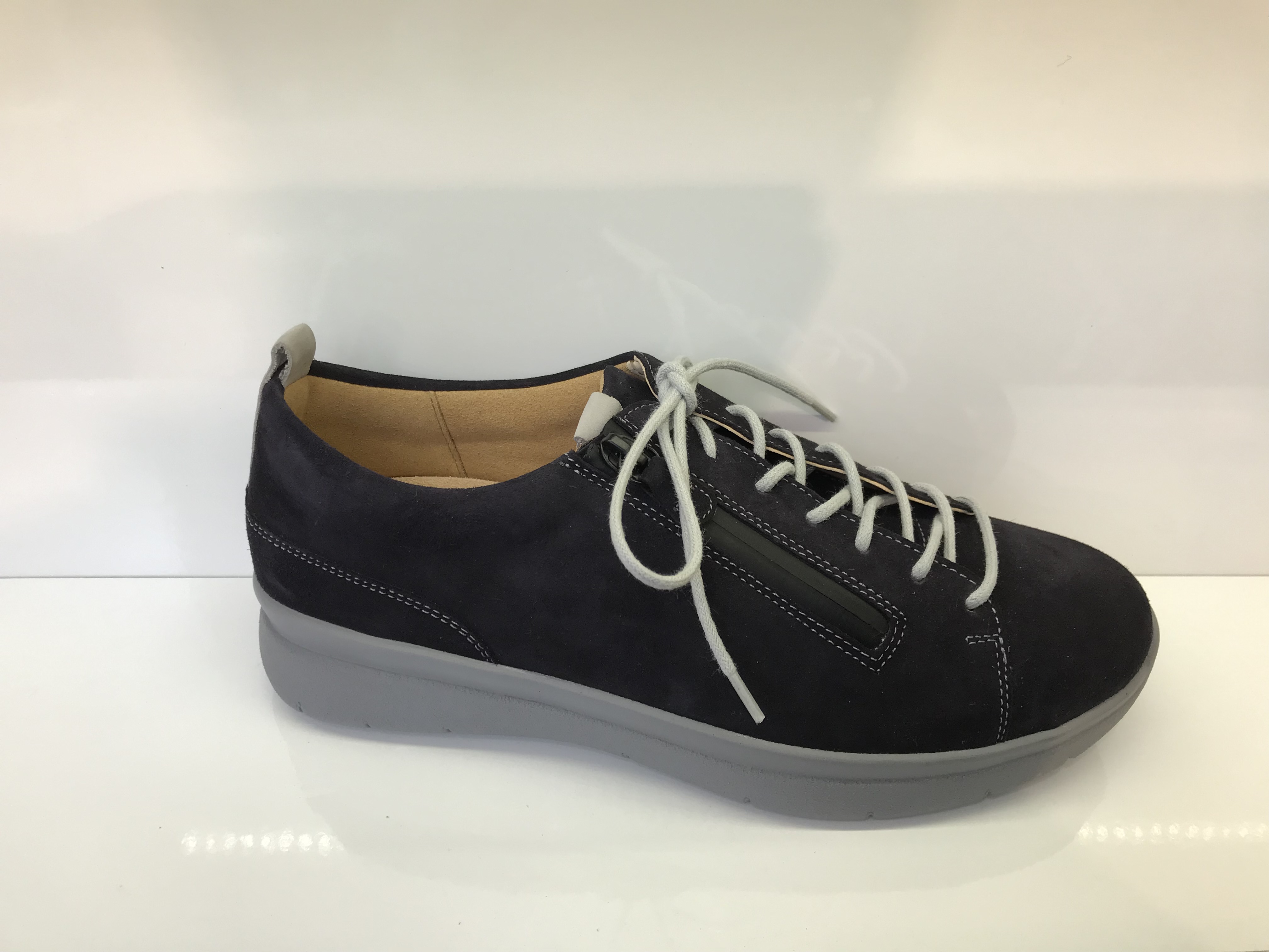 Damenhalbschuhe von Ganter; Obermaterial: Samtziegenleder; Innenmaterial: weiches Lederfutter (Sensitivfutter); herausnehmbares Leichtkorkfußbett; verstellbar durch Schnürung und einem zusätzlichen Reißverschluss; stoßdämpfende 4-Punkt-Sohle sorgt für ein natürliches Barfuß ähnliche Gehgefühl; Graue Sohle; geeignet für empfindliche Füße (wenig Innennähte und viel Platz für die Zehen); für Diabetiker gut geeignet; Weite K; Farbe: Ocean (Dunkelblau)