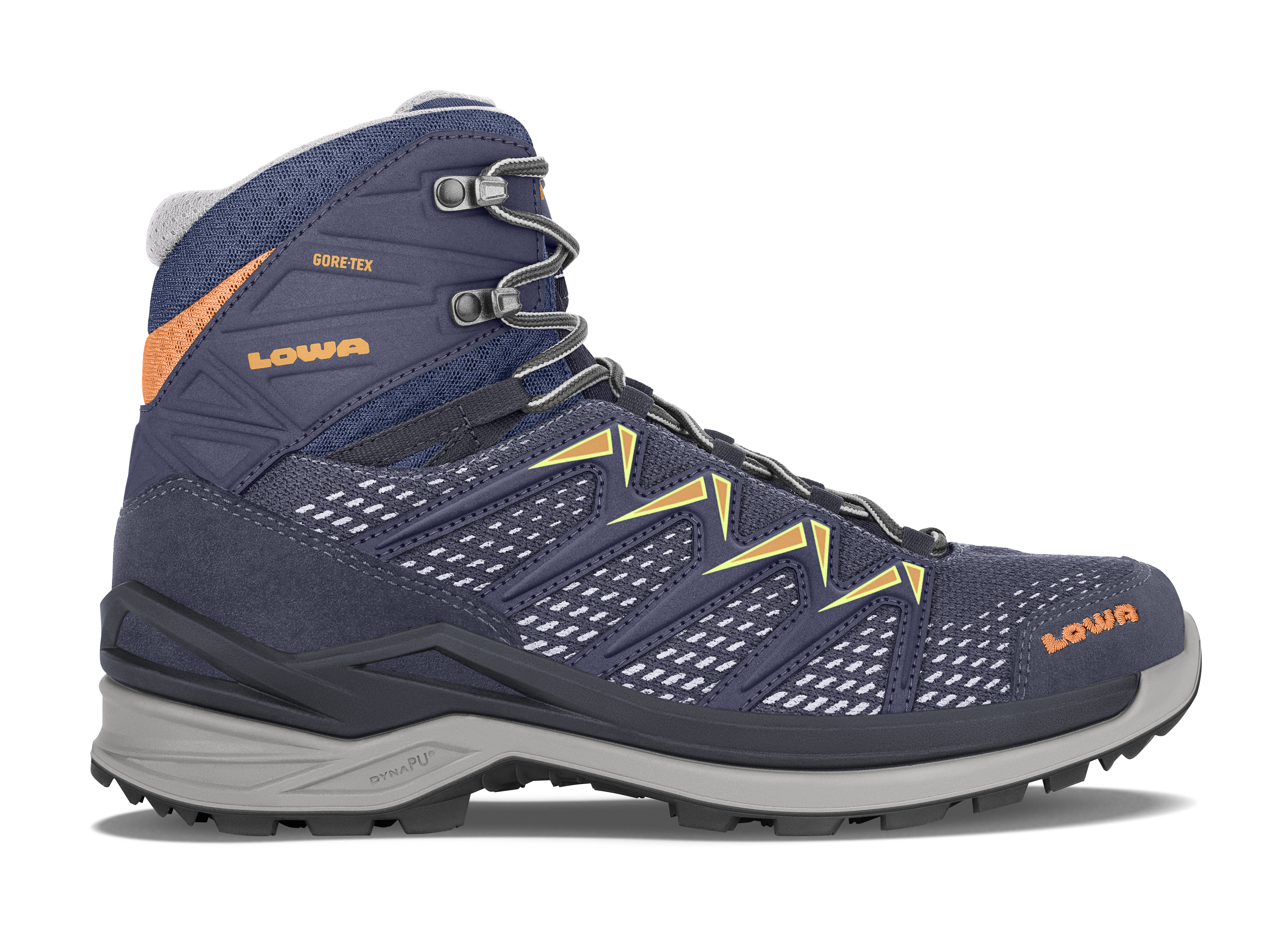 Herrenwanderschuhe von Lowa; Obermaterial: Synthetikmaterial und Nubukleder; Innenmaterial: Textilfutter; Sehr leicht und gute Dämpfung; wasserdicht, atmungsaktiv und Winddicht durch Gore-Tex; herausnehmbares Fußbett; verstellbar durch Schnürung; knöchelhoch; Sohle: LOWA Multi Trac; stabile und rutschhemmende Profilsohle; PU-Zwischensohle; Farbe: Navy/Flame