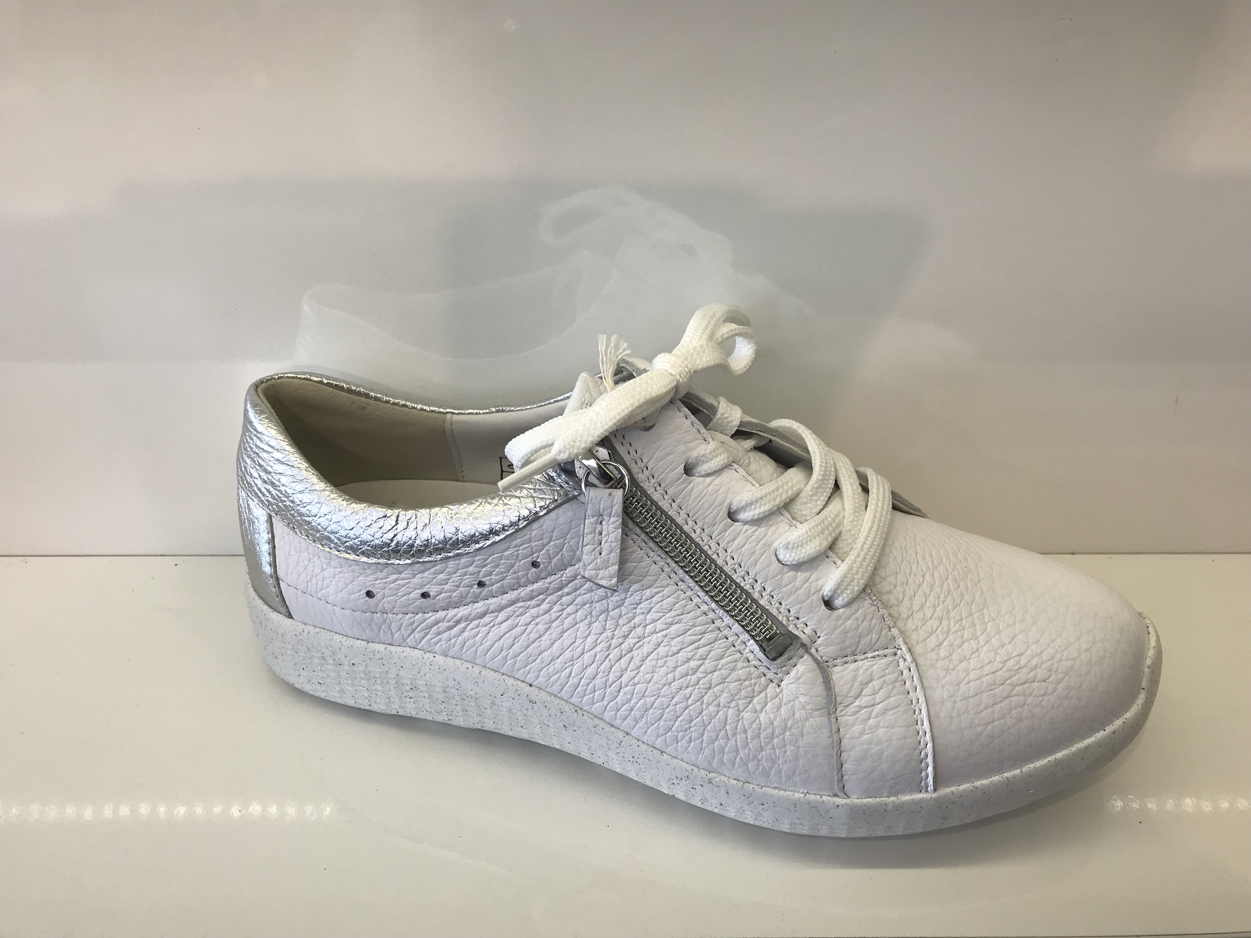 Damenhalbschuhe von Waldläufer; Obermaterial: Hirschleder; Innenmaterial: Leder- und Textilfutter; verstellbar durch Schnürung und einem zusätzlichen Reißverschluss; herausnehmbares Fußbett; PU-Laufsohle; Helle Sohle; Sehr leichtes Modell; Weite K; Farbe: Weiß/Silber