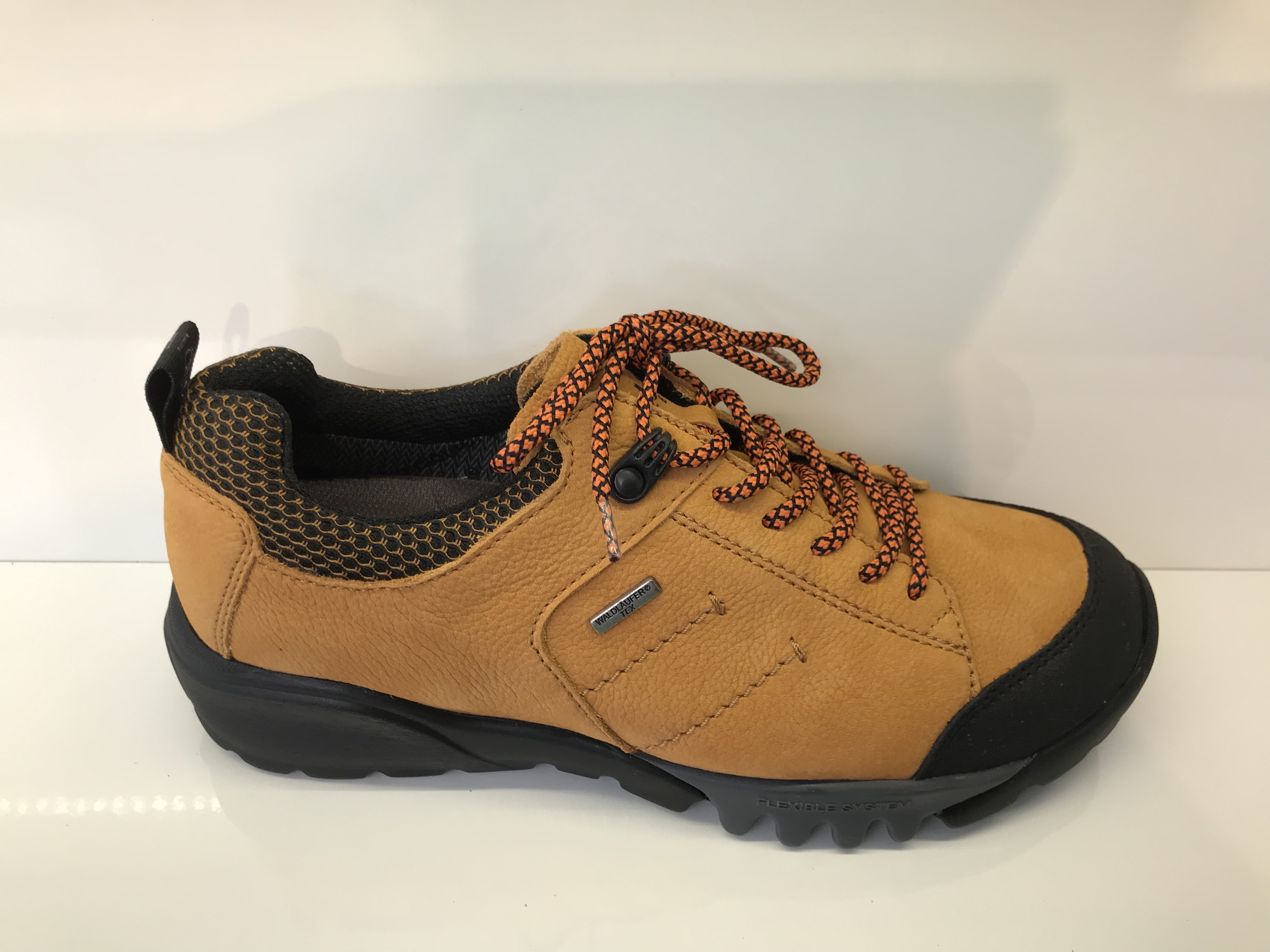 Damen-Trekkinghalbschuhe von Waldläufer; Obermaterial: Narbenleder; Innenmaterial: Textilfutter; herausnehmbares Fußbett; verstellbar durch Schnürung; Profilsohle aus Gummi; wasserabweisend durch Waldläufer-Tex; mit Vorderkappe; Weite H; Farbe: Okka (Gelb)