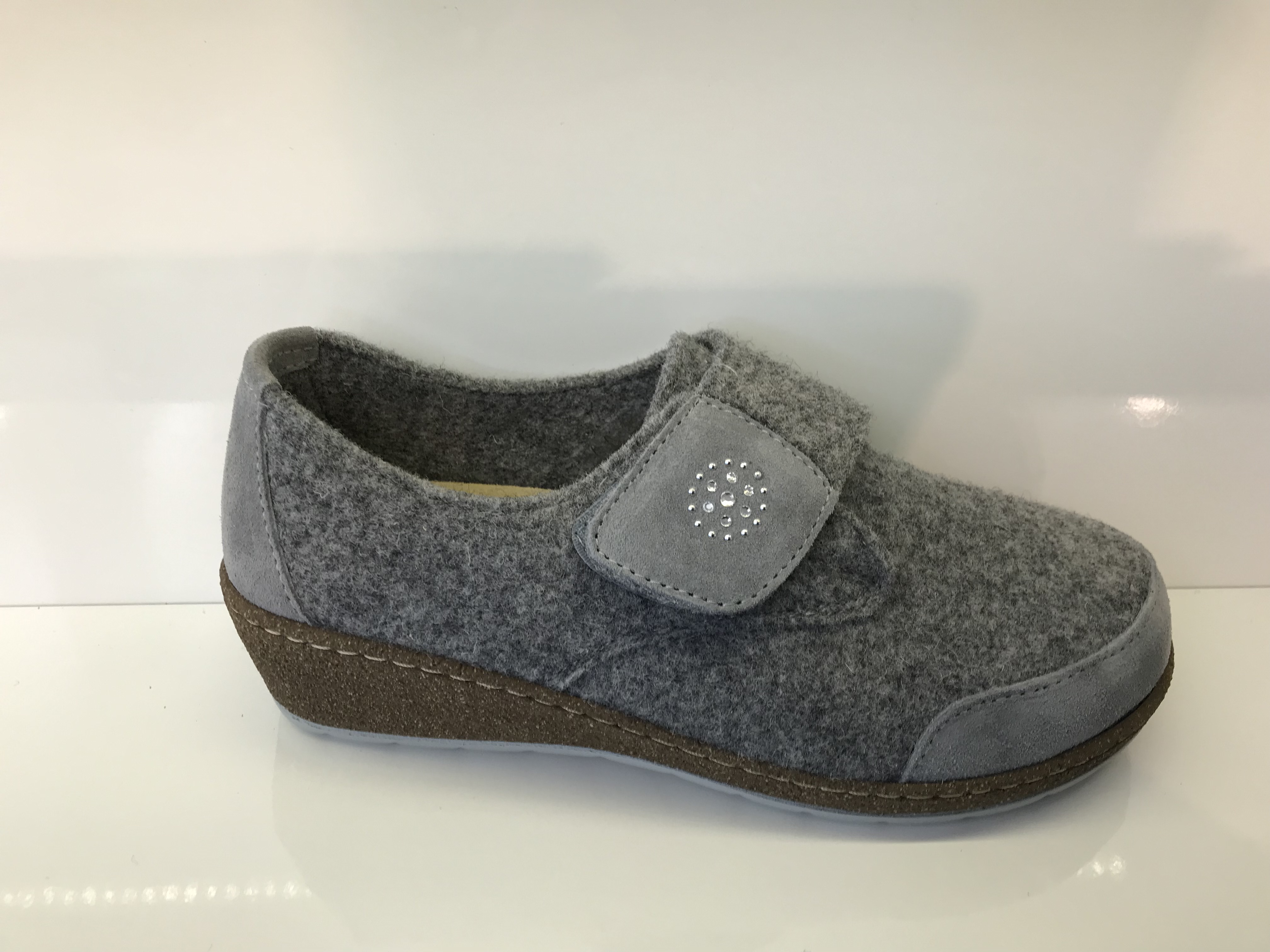 Geschlossener Damenhausschuh von Florett; Obermaterial: Filzmaterial aus Schurwolle und Velourleder; Innematerial: Filzmaterial; herausnehmbares Fußbett mit Lederbezug; verstellbar durch ein Klettverschluss; Korksohle; Absatzhöhe: 3 cm; Weite H; Farbe: Hellgrau