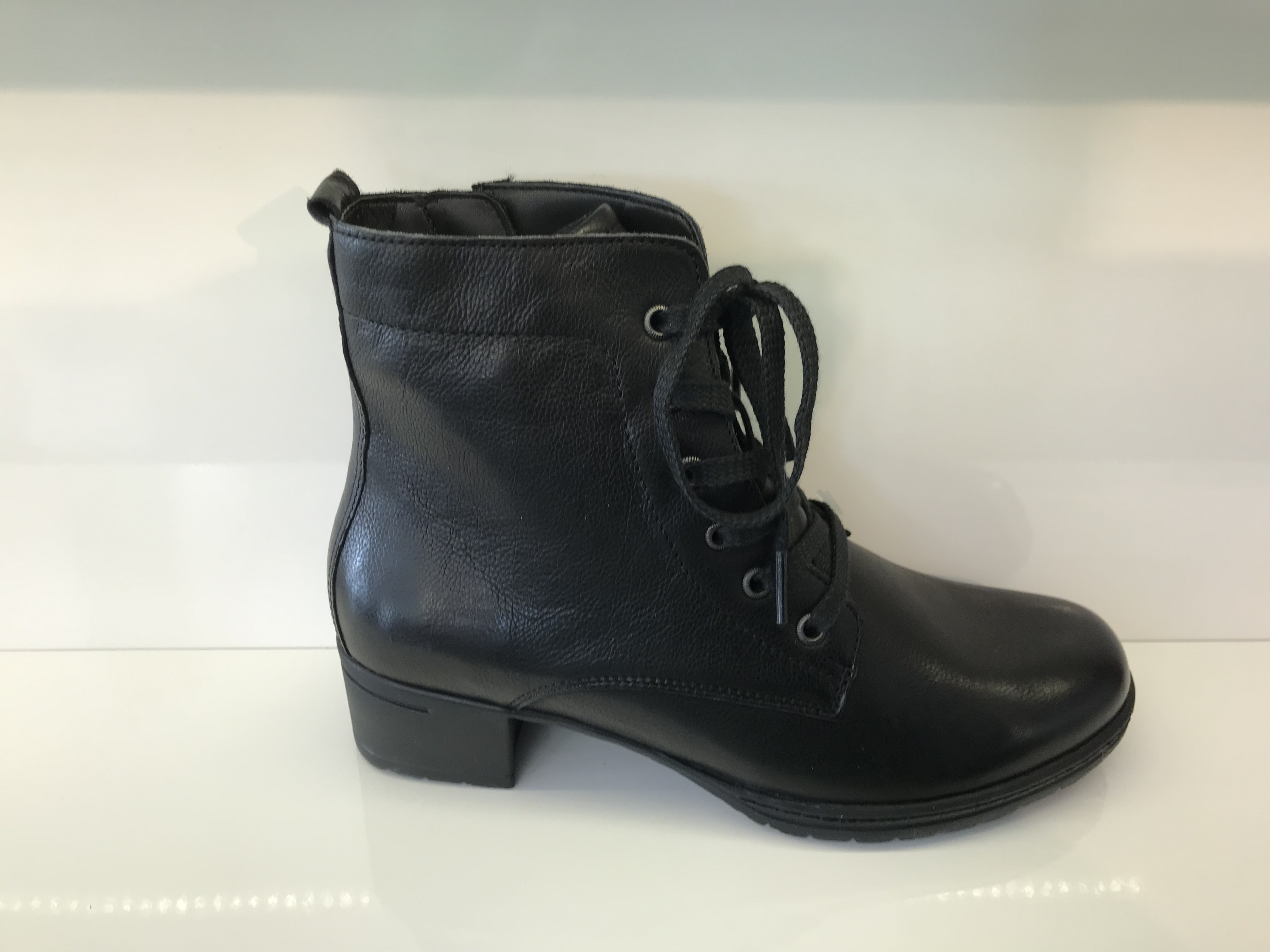 Damenstiefelette von Hartjes; Obermaterial: hochwertiges Nappaleder; Innenmaterial: Lodenfutter; herausnehmbares Leichtkorkfußbett; verstellbar durch Schnürung und auf der Innenseite einen Reißverschluss; PU-Sohle; XS-Sohle für leichteres Abrollen; mit Absatz; Absatzhöhe ca: 3,5 cm; Machart: AGO gezwickt; Weite H; Farbe: Schwarz