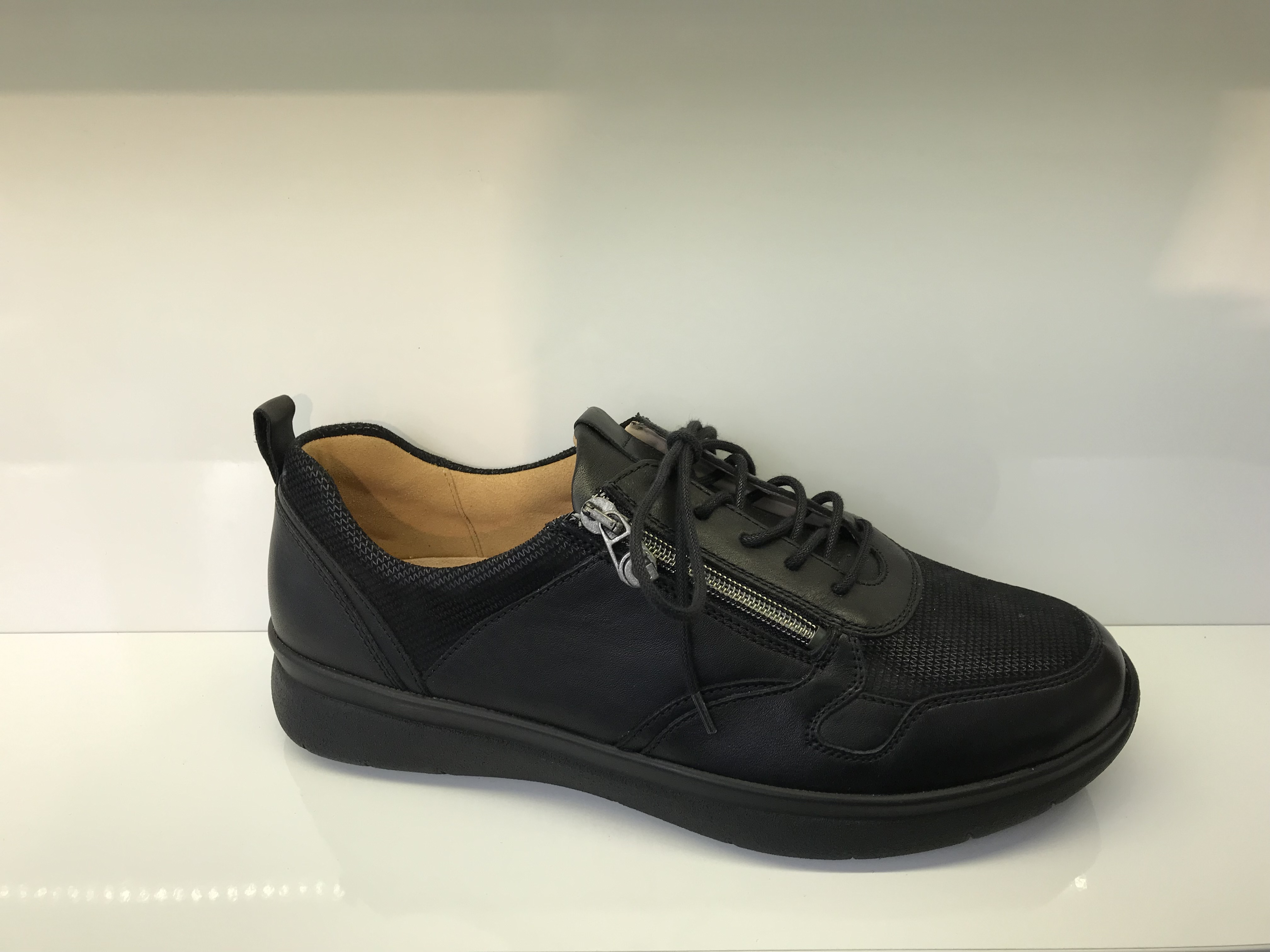 Damenhalbschuhe von Ganter; Obermaterial: Glattleder und geprägtes Nubukleder; Innenmaterial: weiches Lederfutter (Sensitivfutter); herausnehmbares Leichtkorkfußbett; verstellbar durch Schnürung und einem zusätzlichen Reißverschluss; stoßdämpfende 4-Punkt-Sohle sorgt für ein natürliches Barfuß ähnliche Gehgefühl; schwarze Sohle; geeignet für empfindliche Fußfüße (wenig Innennähte und viel Platz für die Zehen); für Diabetiker gut geeignet; Weite K; Farbe: Schwarz