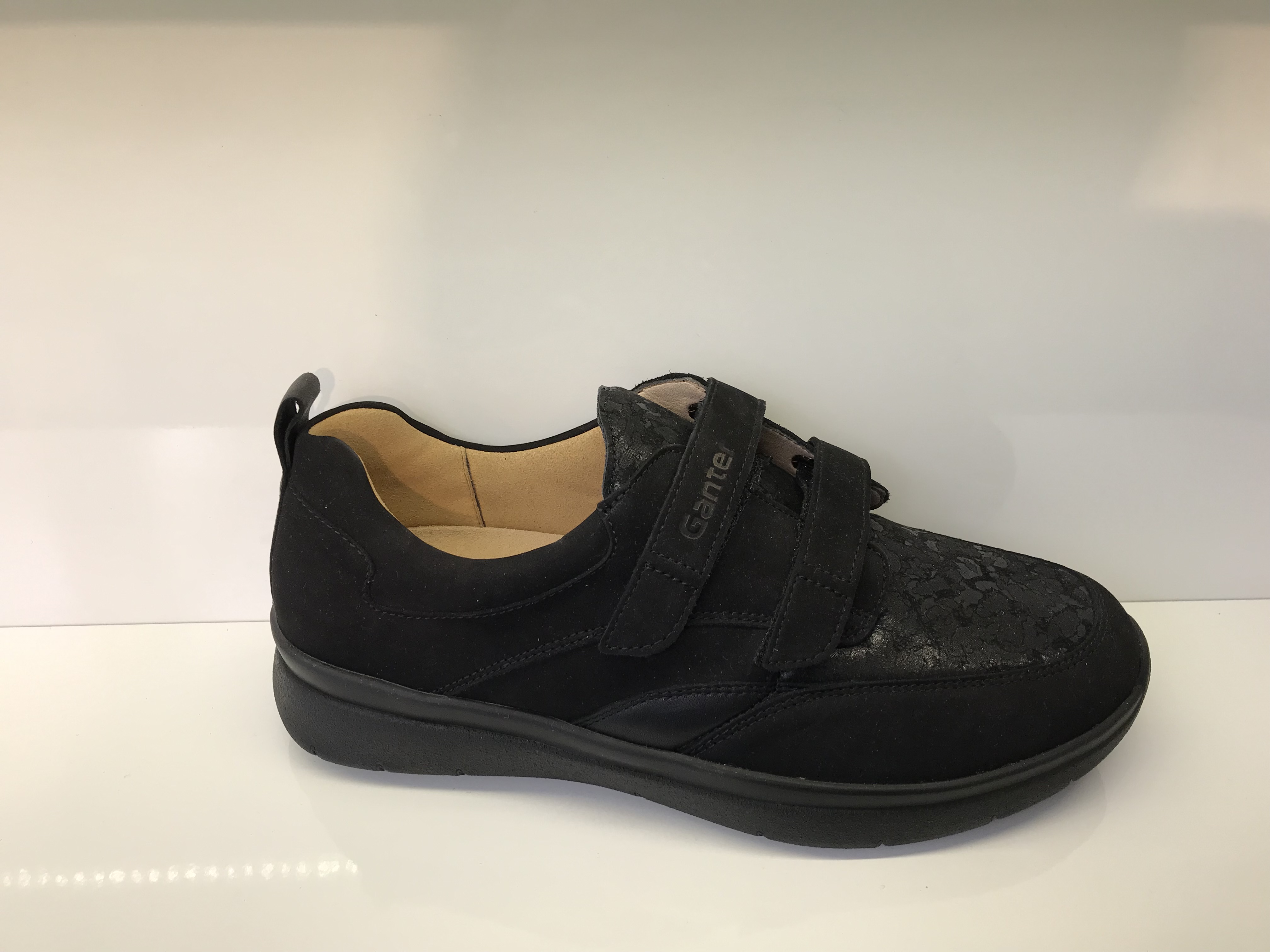 Damenhalbschuhe von Ganter; Obermaterial: Nubukleder und Strechmaterial; Innenmaterial: weiches Lederfutter (Sensitivfutter); herausnehmbares Leichtkorkfußbett; verstellbar durch zwei Klettverschlüsse; stoßdämpfende 4-Punkt-Sohle sorgt für ein natürliches Barfuß ähnliche Gehgefühl; schwarze Sohle; geeignet für empfindliche Fußfüße (wenig Innennähte und viel Platz für die Zehen); für Diabetiker gut geeignet; Weite K; Farbe: Schwarz
