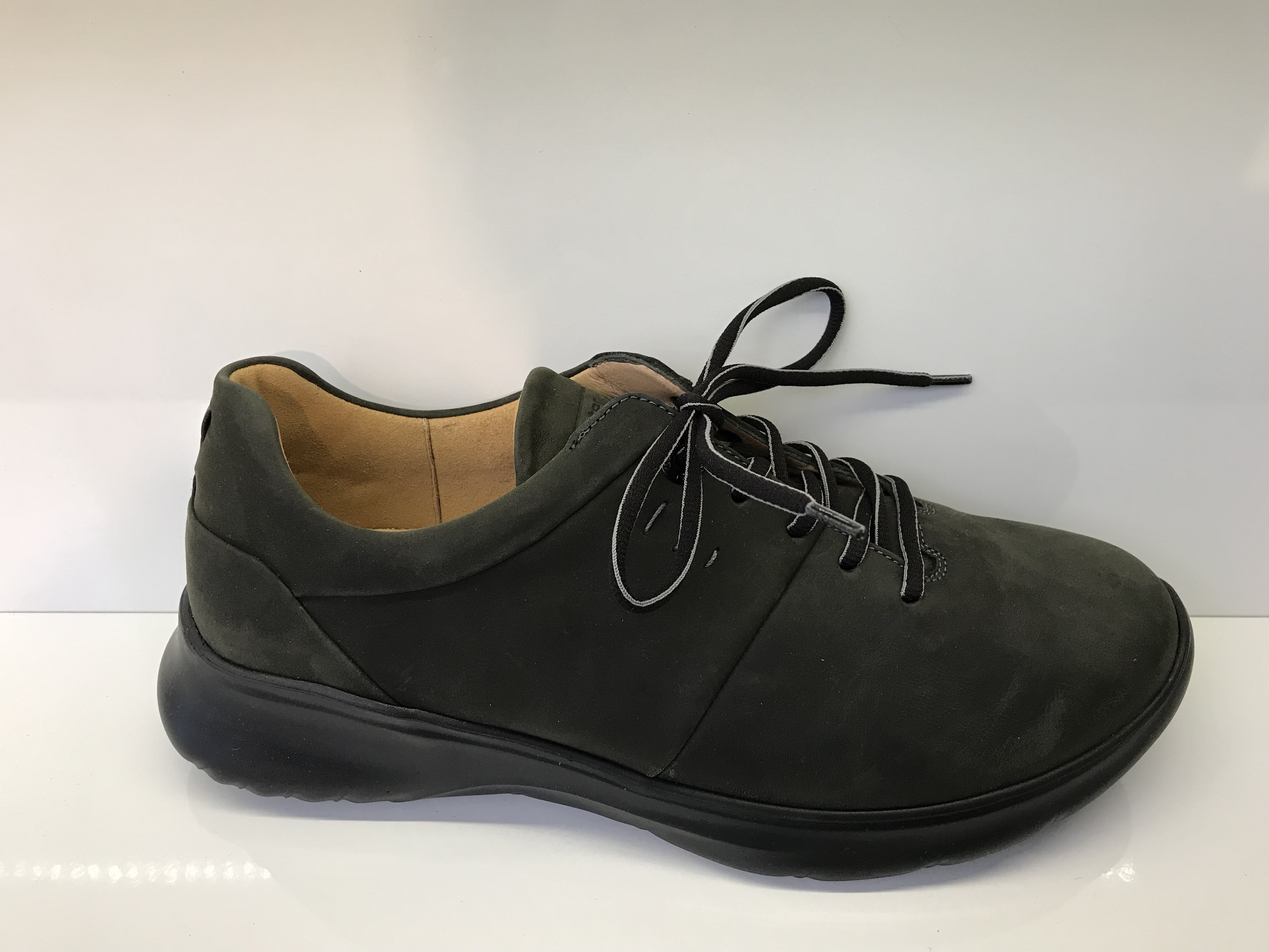 Damenhalbschuhe von Ganter; Obermaterial: Softnubukleder; Innenmaterial: weiches Lederfutter (Sensitivfutter); herausnehmbares Leichtkorkfußbett; verstellbar durch Schnürung; stoßdämpfende 4-Punkt-Sohle sorgt für ein natürliches Barfuß ähnliche Gehgefühl; Schwarze Sohle; Sehr leicht; geeignet für empfindliche Fußfüße (wenig Innennähte und mit viel Platz für die Zehen); für Diabetiker gut geeignet; Weite I; Farbe: Darkoliv