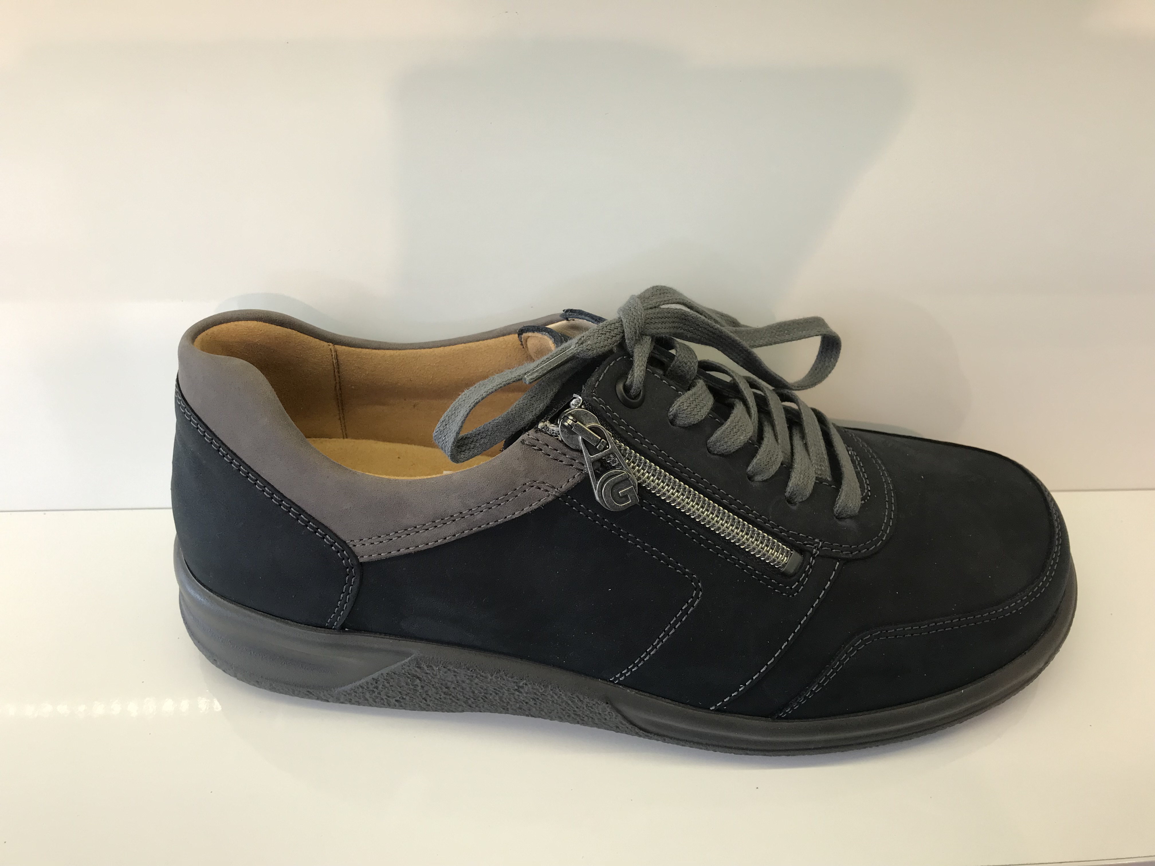 Herrenhalbschuhe von Ganter; Obermaterial: Nubukleder; Innenmaterial: weiches Lederfutter (Sensitivfutter); herausnehmbares Leichtkorkfußbett; verstellbar durch Schnürung und zusätzlichem Reißverschluss; stoßdämpfende 4-Punkt-Sohle sorgt für ein natürliches Barfuß ähnliche Gehgefühl; Helle Sohle; rutschhemmende Gripsohle; geeignet für empfindliche Fußfüße (wenig Innennähte und mit viel Platz für die Zehen); für Diabetiker gut geeignet; Weite K; Farbe: Darkblue-Ash (Dunkelblau/Anthrazit)