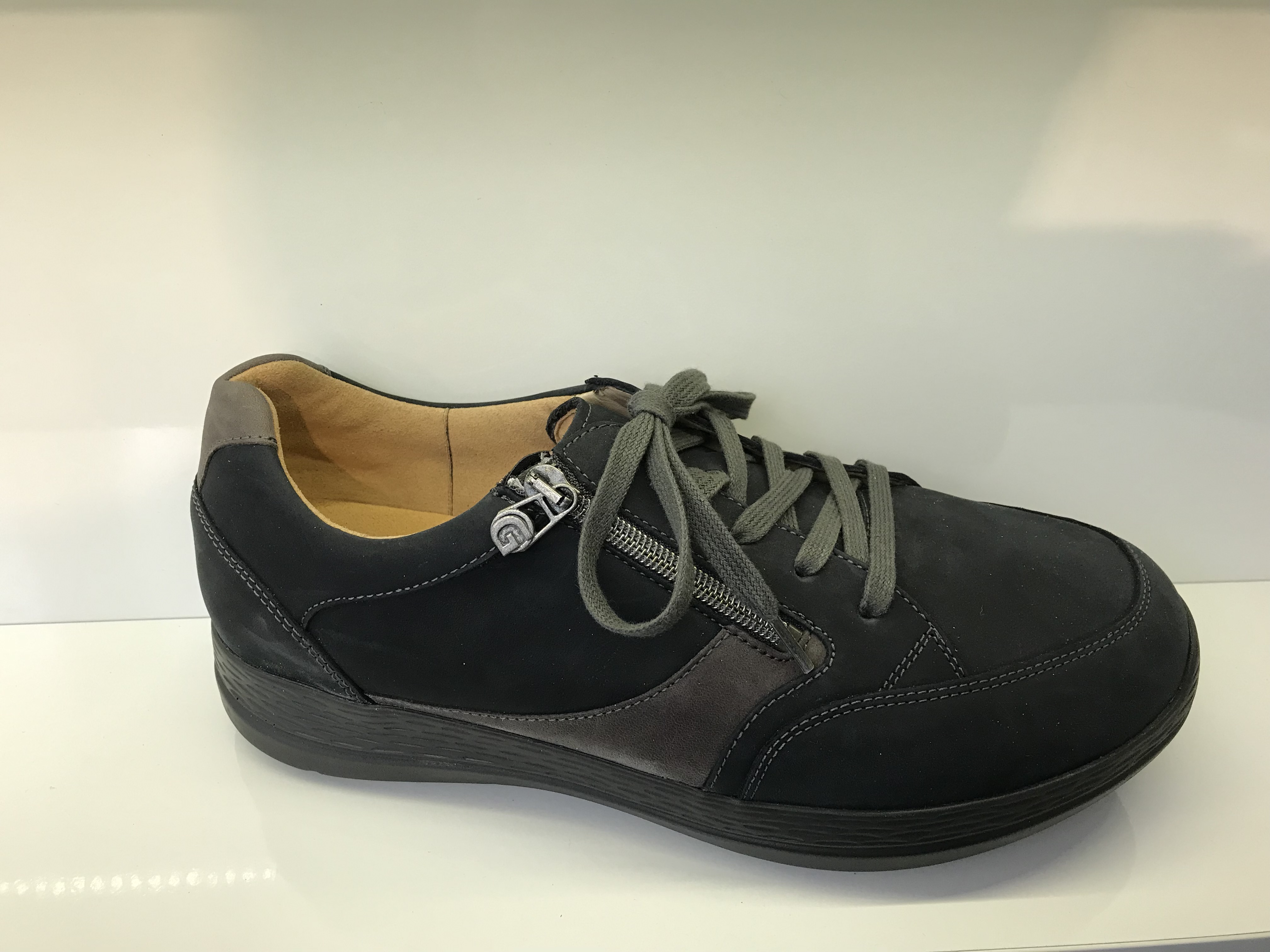 Herrendiabtetikerschuhe von Ganter; Obermaterial: Nubukleder; Innenmaterial: Sensitiv-Lederfutter; (Geeignet für empfimdliche Füße und Diabetiker); herausnehmbares anatomisch geformtes Korkfußbett; verstellbar durch Schnürung und einem zusätzlichen Reißverschluss; die stoßdämpfende 4-Punkt Sohle sorgt für ein natürliches Gehvergnügen; profilierte rutschhemmende Sohle; Sohlenversteifung; Fällt weit aus; Weite K-L; Farbe: Darkblue-Ash (Dunkelblau-Anthrazit)