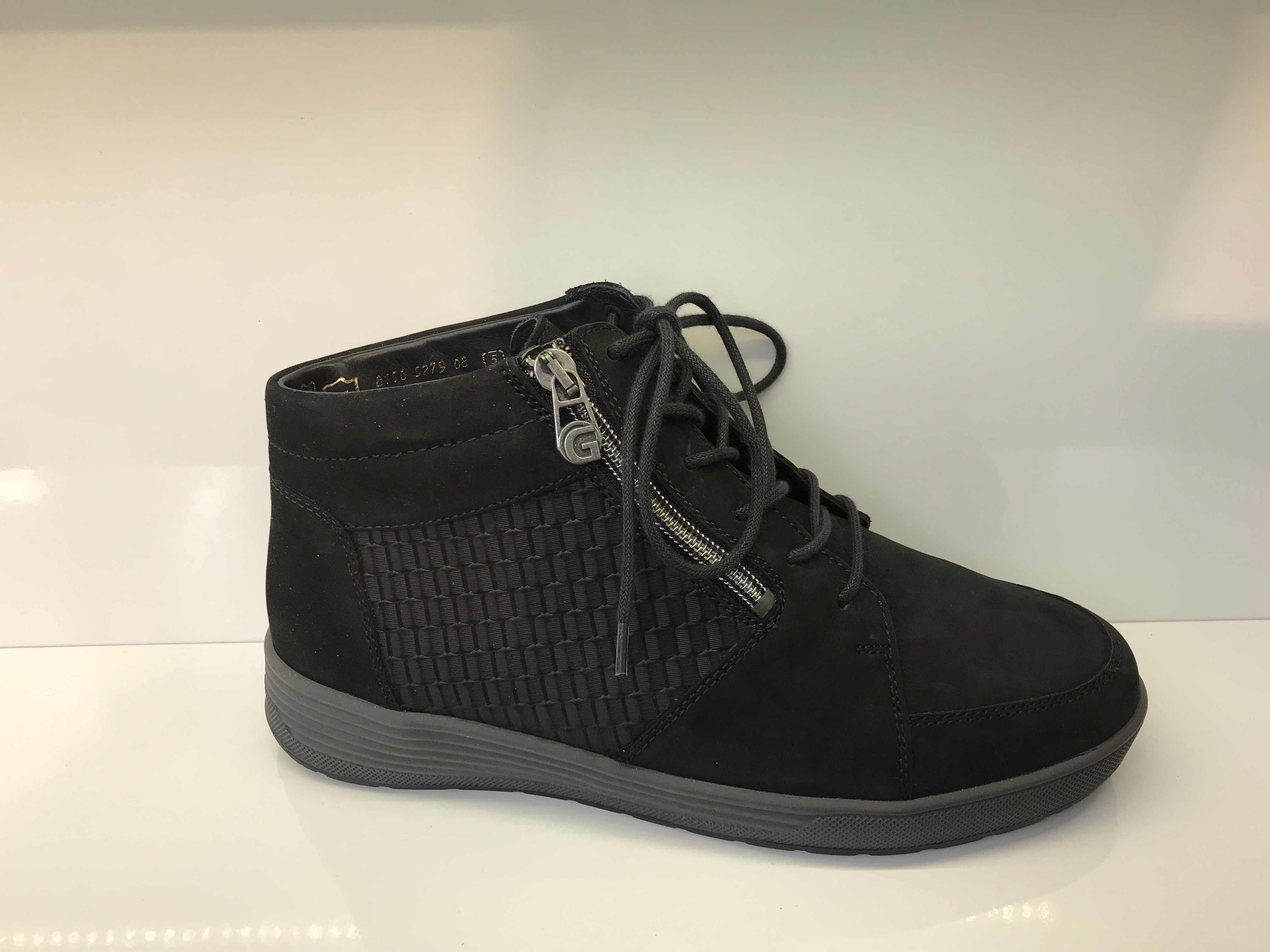 Damenschuhe knöchelhoch von Ganter; Obermaterial: Softnubukleder und seitlich Flechtnubuk; Innenmaterial: weiches Sensitiv-Loderfutter; herausnehmbares anatomisch geformtes Leichtkorkfußbett; verstellbar durch Schnürung und einem Reißverschluss auf der Außenseite; stoßdämpfende 4-Punkt-Sohle sorgt für ein natürliches Barfuß ähnliche Gehgefühl; graue Sohle; geeignet für empfindliche Fußfüße (wenig Innennähte und mit viel Platz für die Zehen); für Diabetiker gut geeignet; Weite K; Farbe: Schwarz