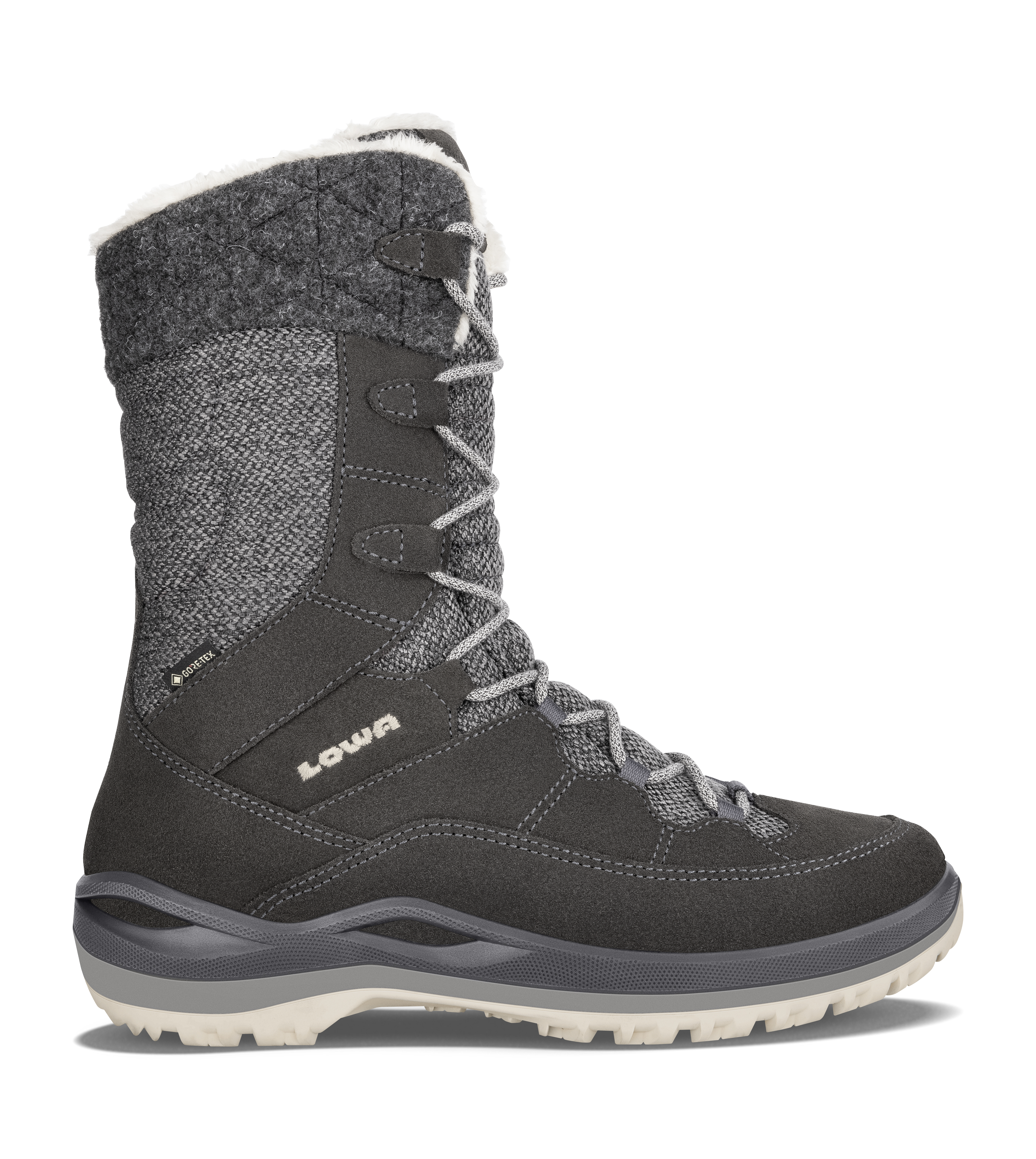 Damenwinterstiefel von Lowa; Obermaterial: Velourleder und Textilmaterial; Innenmaterial: Warmfutter (Gore-Tex-Futter); wasserdicht und atmungsaktiv durch Gore-Tex; herausnehmbares Fußbett; verstellbar durch Schnürung und mit zusätzlichen Reißverschluss auf der Innenseite; Sohle: LOWA AL-S VI; rutschhemmende Profilsohle mit optimaler Griffigkeit; Farbe: Anthrazit/Champanger