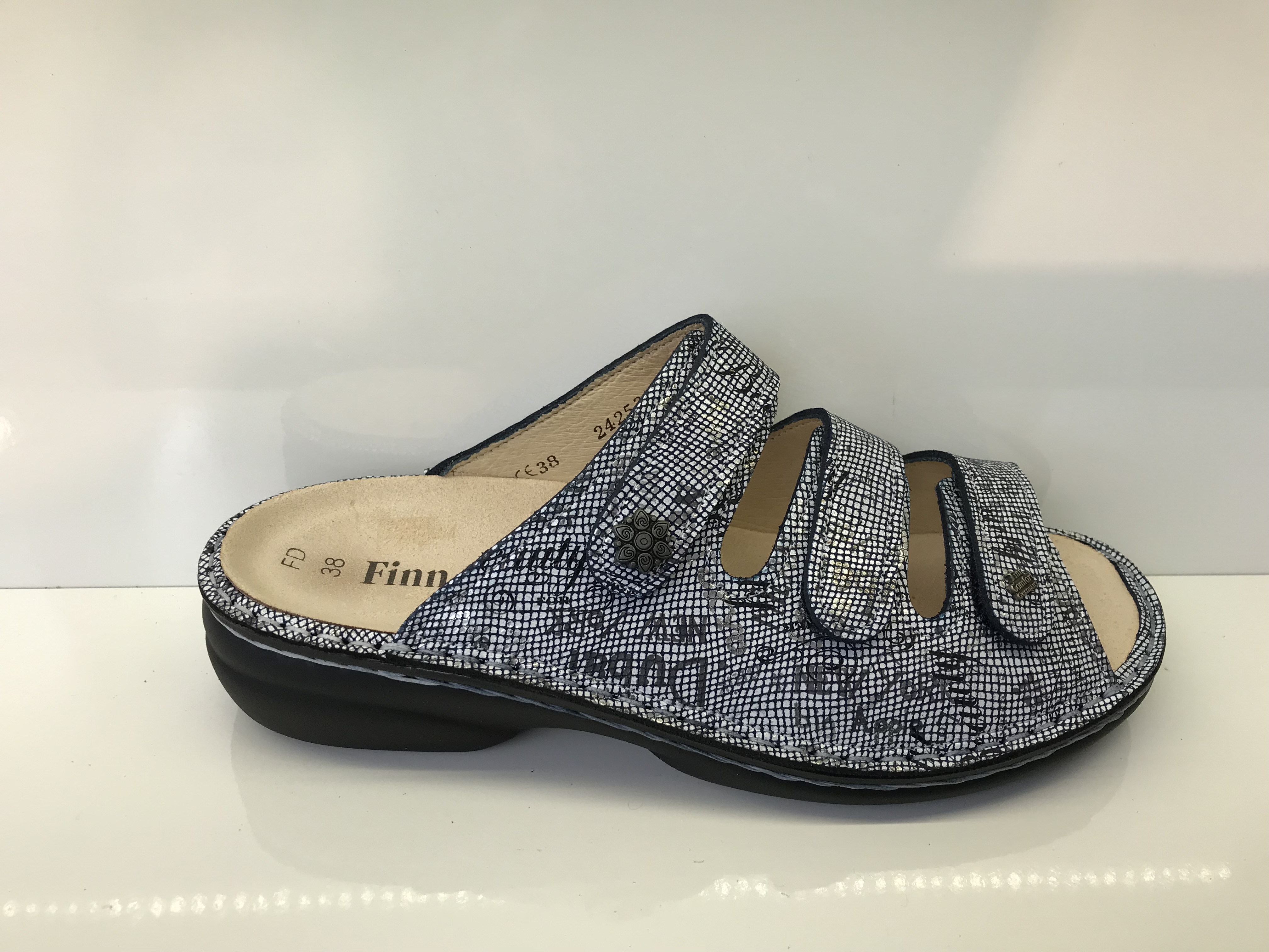 Damenpantolette von Finn Comfort; Obermaterial: Nubukleder mit Prägung; Innenmaterial: Lederfutter; Sohle: PU-Sohle; herausnehmbares anatomisch geformtes Softfußbett; verstellbar durch drei Klettverschlüsse; Form: Menorca-S; Weite D; Farbe: Blau Words