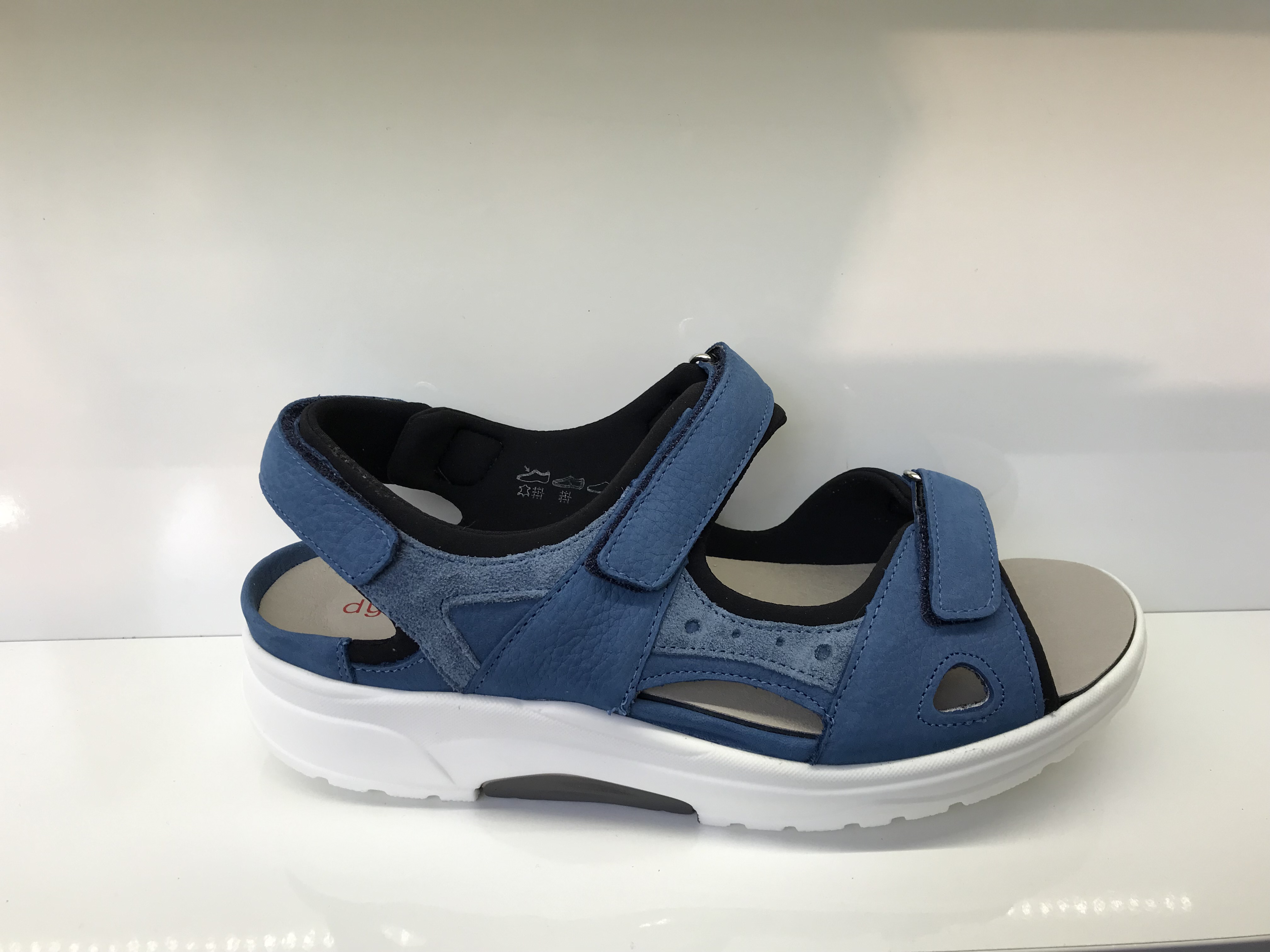 Damensandale von Waldläufer; Obermaterial: Nubukleder; Innenmaterial: Lederfutter; herausnehmbares Fußbett; verstellbar durch zwei Klettverschlüsse und einem Fersenriemen mit Klettverschluss; Helle Sohle; Dynamic-Laufsohle für leichtes Abrollen; Weite H; Farbe: Blau