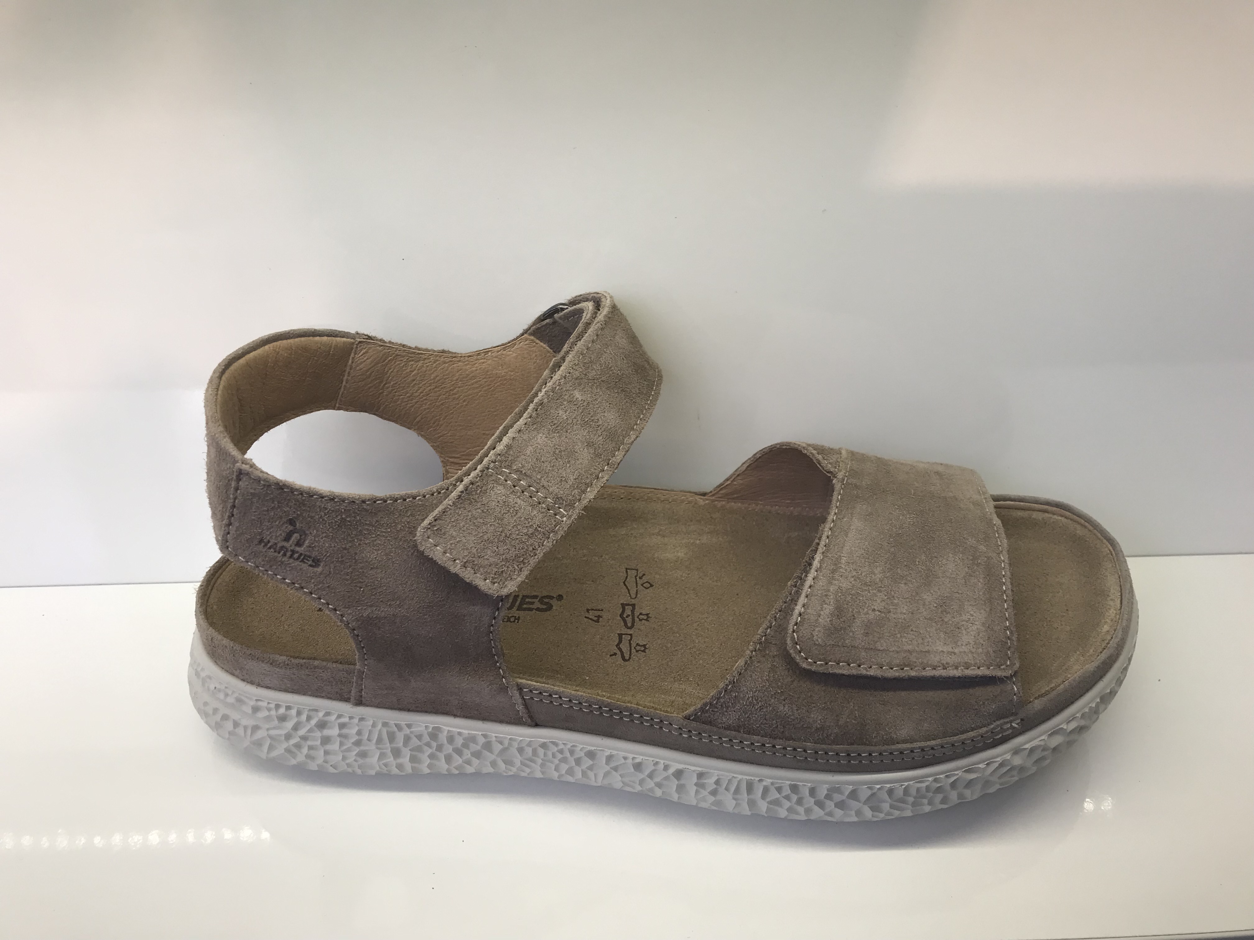 Damensandale von Hartjes; Obermaterial: hochwertiges Velourleder; Innematerial: Hochwertiges Lederfutter; herausnehmbares Fußbett; verstellbar durch zwei Klettverschlüsse und einem nicht verstellbarem Fersenriemen; Helle Sohle; Machart: Gestrobelt; Weite H; Farbe: Schlamm