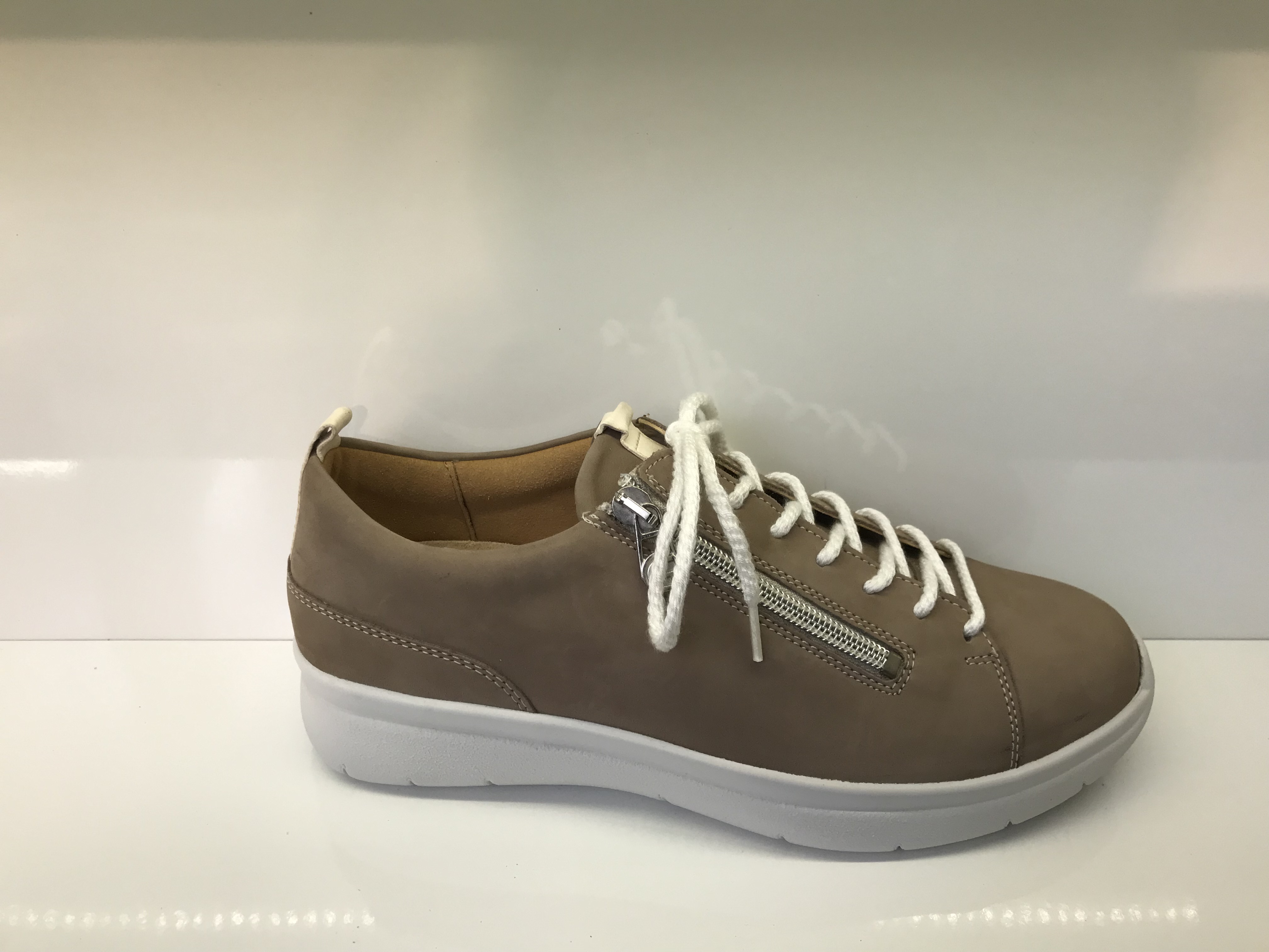 Damenhalbschuhe von Ganter; Obermaterial: Softnubukleder; Innenmaterial: weiches Lederfutter (Sensitivfutter); herausnehmbares Leichtkorkfußbett; verstellbar durch Schnürung und einem zusätzlichen Reißverschluss; stoßdämpfende 4-Punkt-Sohle sorgt für ein natürliches Barfuß ähnliche Gehgefühl; Helle Sohle; geeignet für empfindliche Füße (wenig Innennähte und viel Platz für die Zehen); für Diabetiker gut geeignet; Weite K; Weiße Sohle; Farbe: Taupe