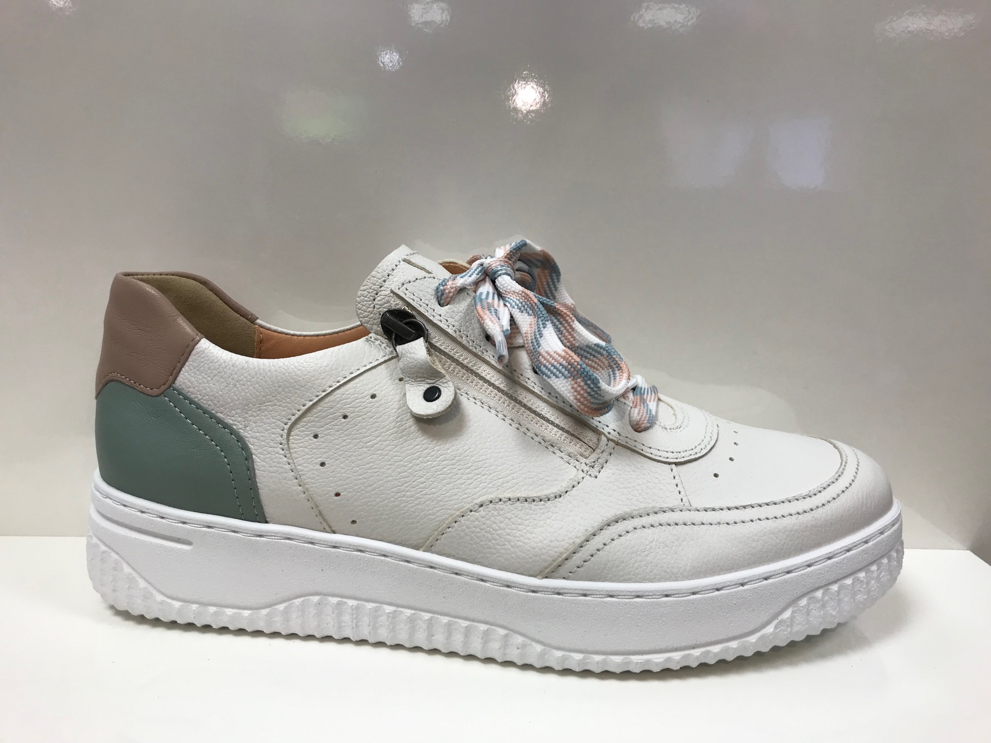 Damenhalbschuhe von Hartjes; Obermaterial: Hochwertiges Lederkombi aus Glatt-und Nubukleder; Innenmaterial: hochwertiges Lederfutter; verstellbar durch Schnürung und einem seitlichem Reißverschluss; herausnehmbares Leichtkorkfußbett; Machart: gestrobelt; Weite H; Farbe: Weiß/Patellgrün, mit farbigen Scnürsenkel
