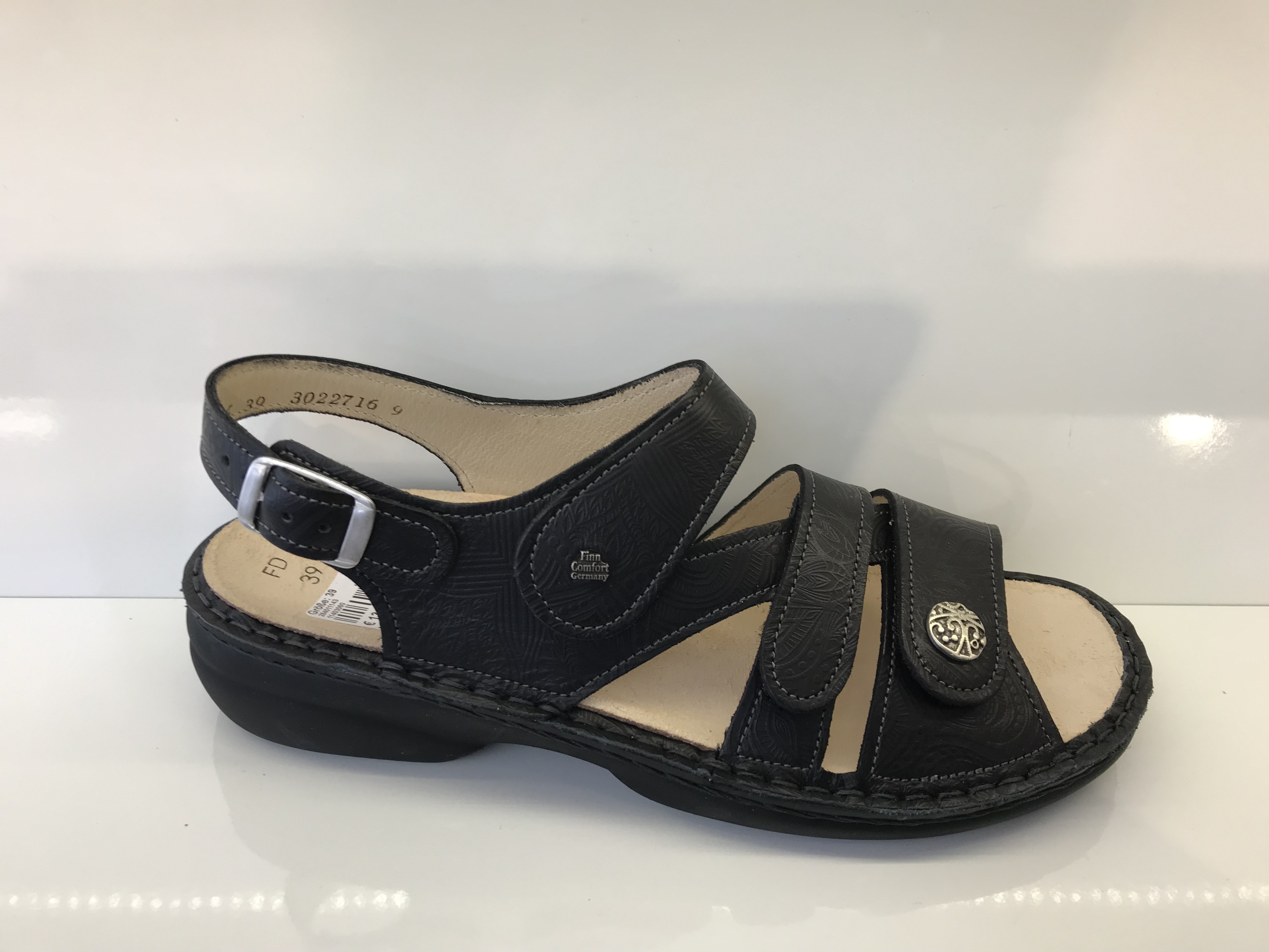 Damensandale von Finn Comfort; Obermaterial: geprägtes Glattleder; Innenmaterial: Lederfutter; Sohle: PU-Sohle; verstellbar durch drei dünne Klettverschluss und einen Fersenriemchen; herausnehmbares Soft-Korkfußbett; Form: Gomera; Weite D ; Farbe: Schwarz