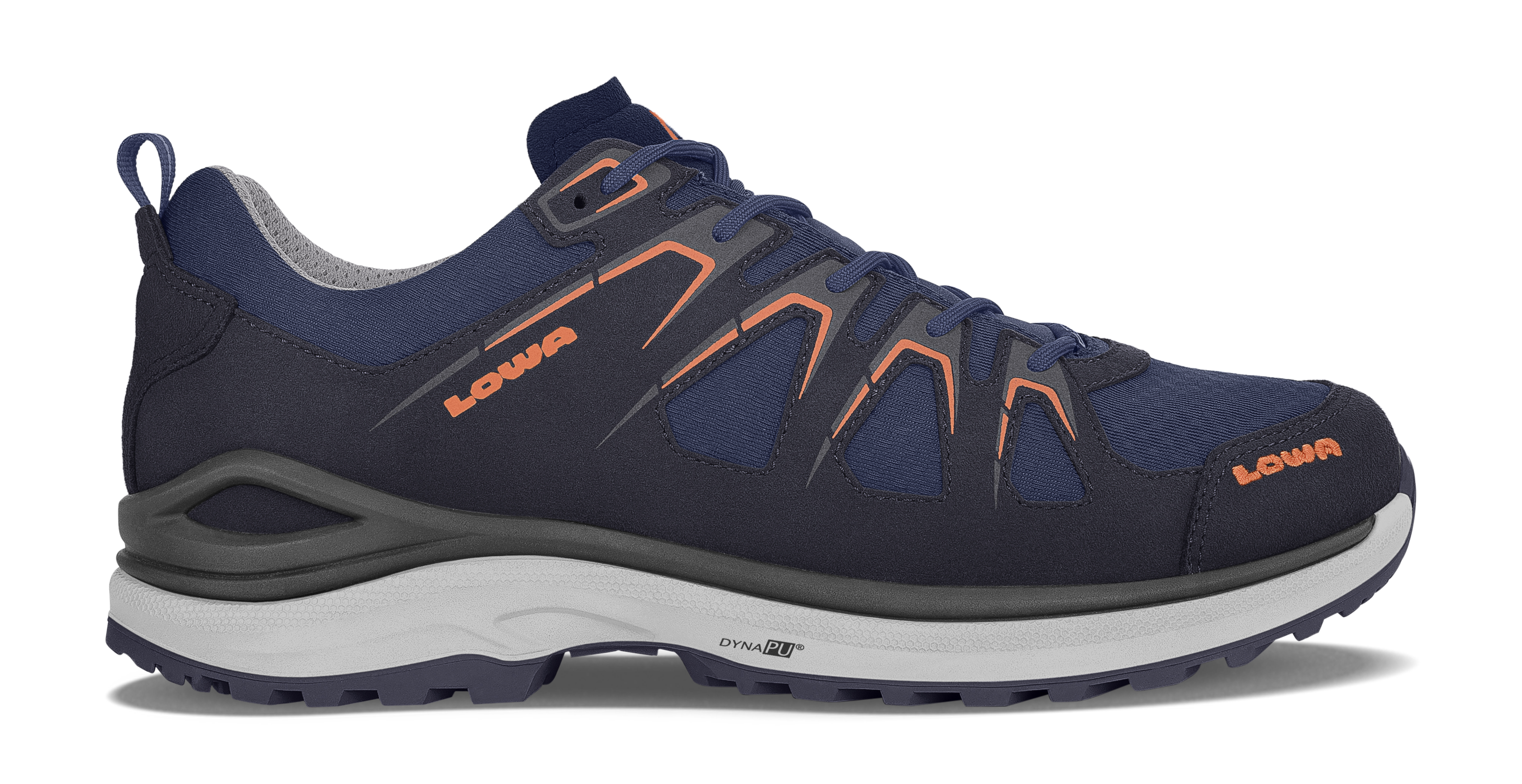 Herrenwanderschuhe von Lowa; Obermaterial: Textil- und Microfasermaterial; Innenmaterial: Textilfutter; herausnehmbares Fußbett; Wasserdicht und atmungsaktiv durch Gore-Tex; verstellbar durch Schürung; Sohle: LOWA Enduro Evo; abriebfeste Gummimischung für einen perfekten Grip; Weite: für normale Füße; Farbe: Navy/Flame