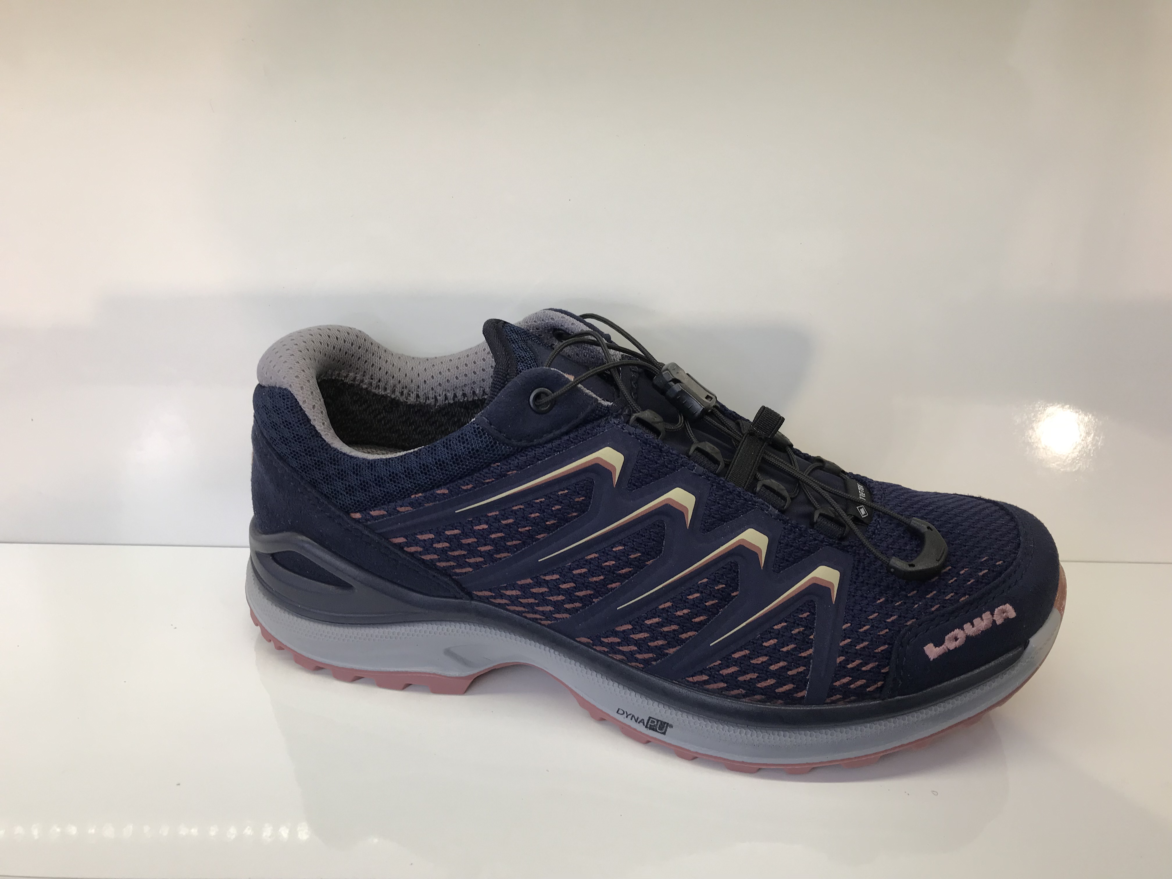 Damenhalbschuhe von Lowa; Obermaterial: Textil- und Synthetikmaterial; Innenmaterial: Textilfutter; herausnehmbarem Fußbett; atmungsaktiv und wasserabweisend durch Gore-Tex; Sohle: Lowa Enduro Evo (sehr weich); abriebfeste Gummimischung; Verstellbar durch Speed-Lace-Technologie (einem Zipperverschluss); Weite: für normale Füße; Farbe: Navy/Champagner