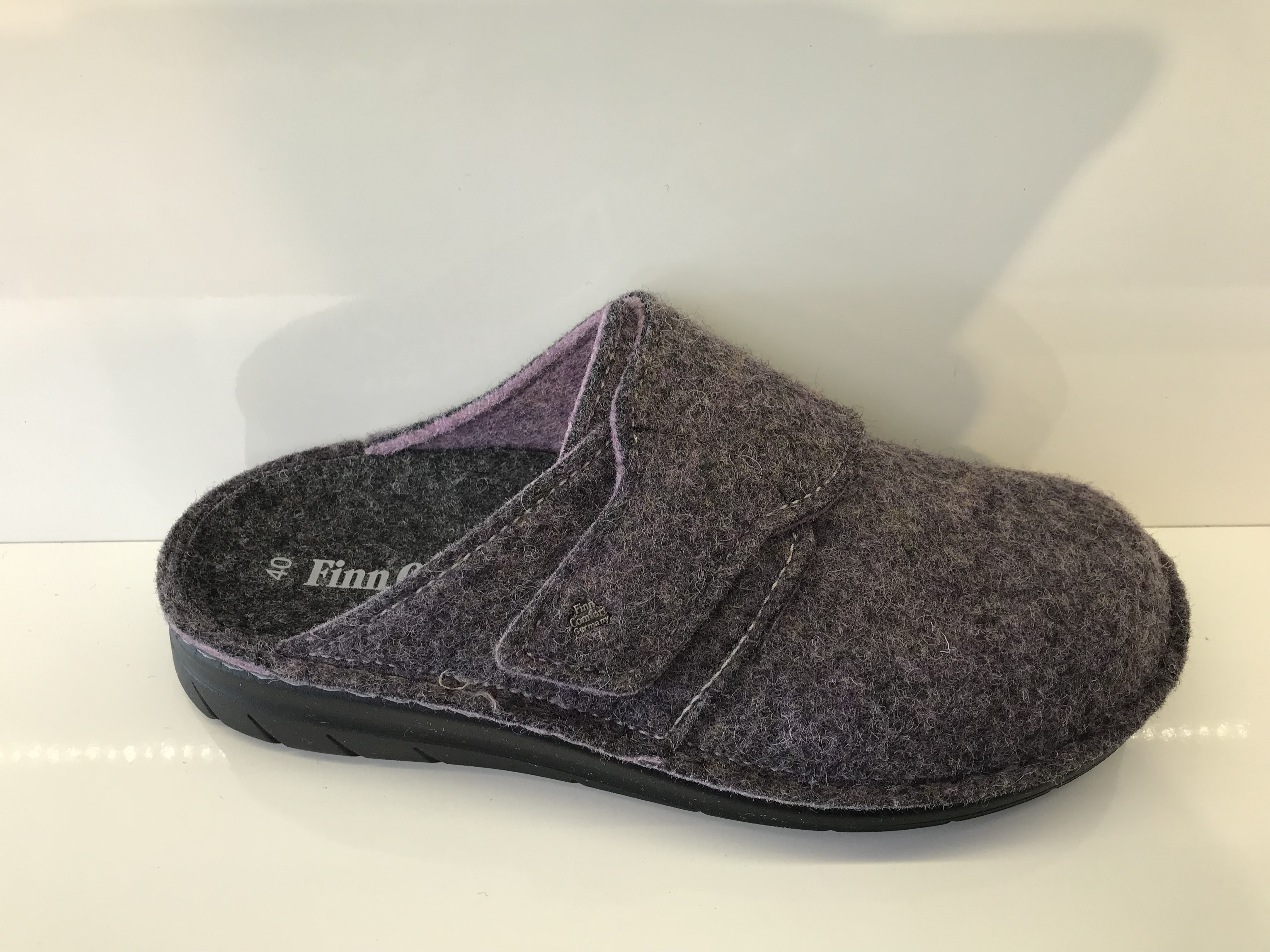 Damenhausschuhe von Finn Comfort; Obermaterial: 100% Wollfilzmaterial; Innenmaterial: Filzmaterial aus 70% Wolle; herausnehmbares anatomisch geformtes Korkfußbett mit Filzmaterial überzogen; verstellbar durch ein Klettverschluss; Dunkle Sohle PU-Laufsohle; Weite D; Farbe: Lila
