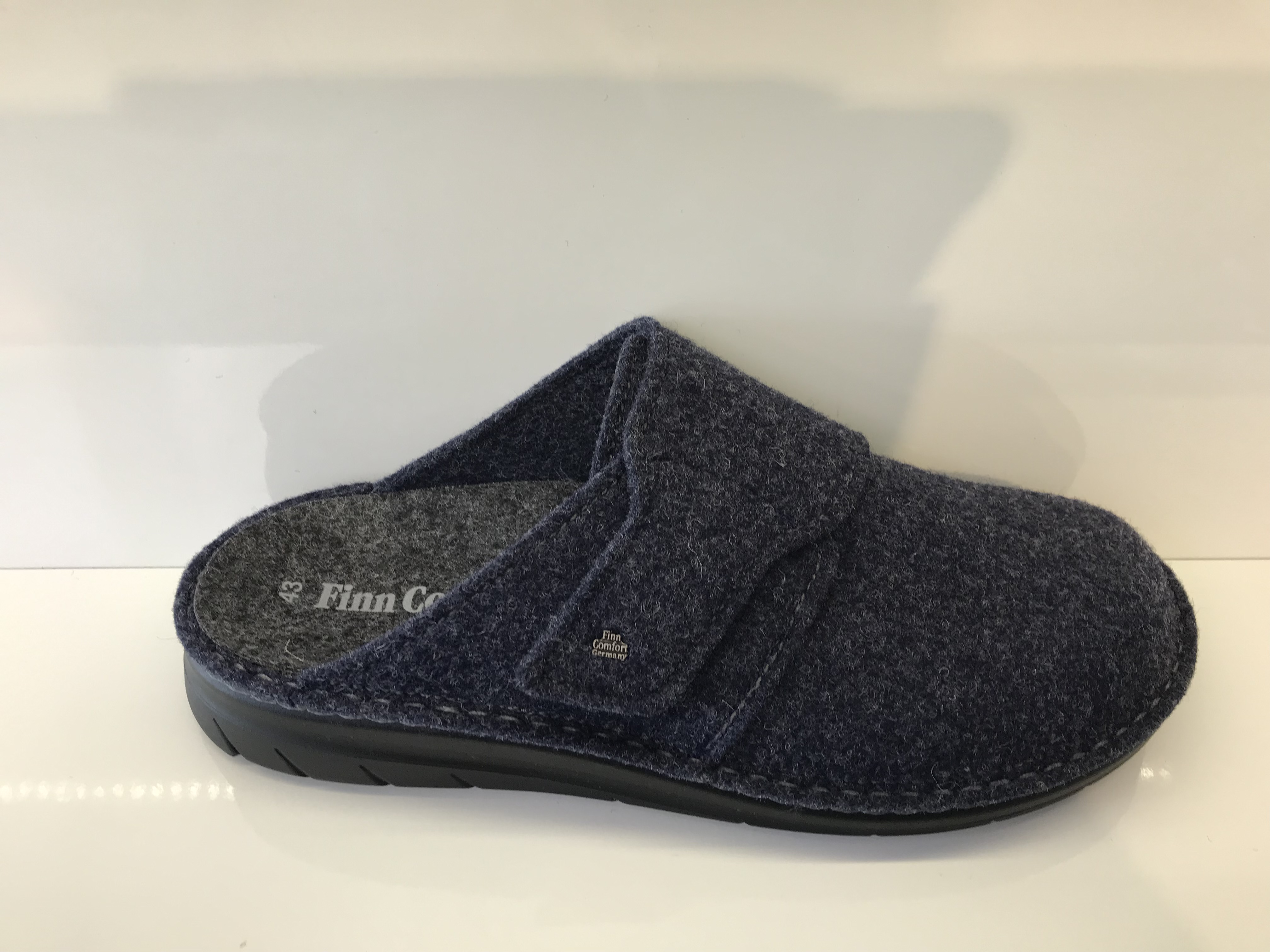 Herrenhausschuhe von Finn Comfort; Obermaterial: 100% Wollfilzmaterial; Innenmaterial: Filzmaterial aus 70% Wolle; herausnehmbares anatomisch geformtes Korkfußbett mit Filzmaterial überzogen; verstellbar durch ein Klettverschluss; Dunkle Sohle PU-Laufsohle; Weite D; Farbe:Darkblue (Dunkelblau)