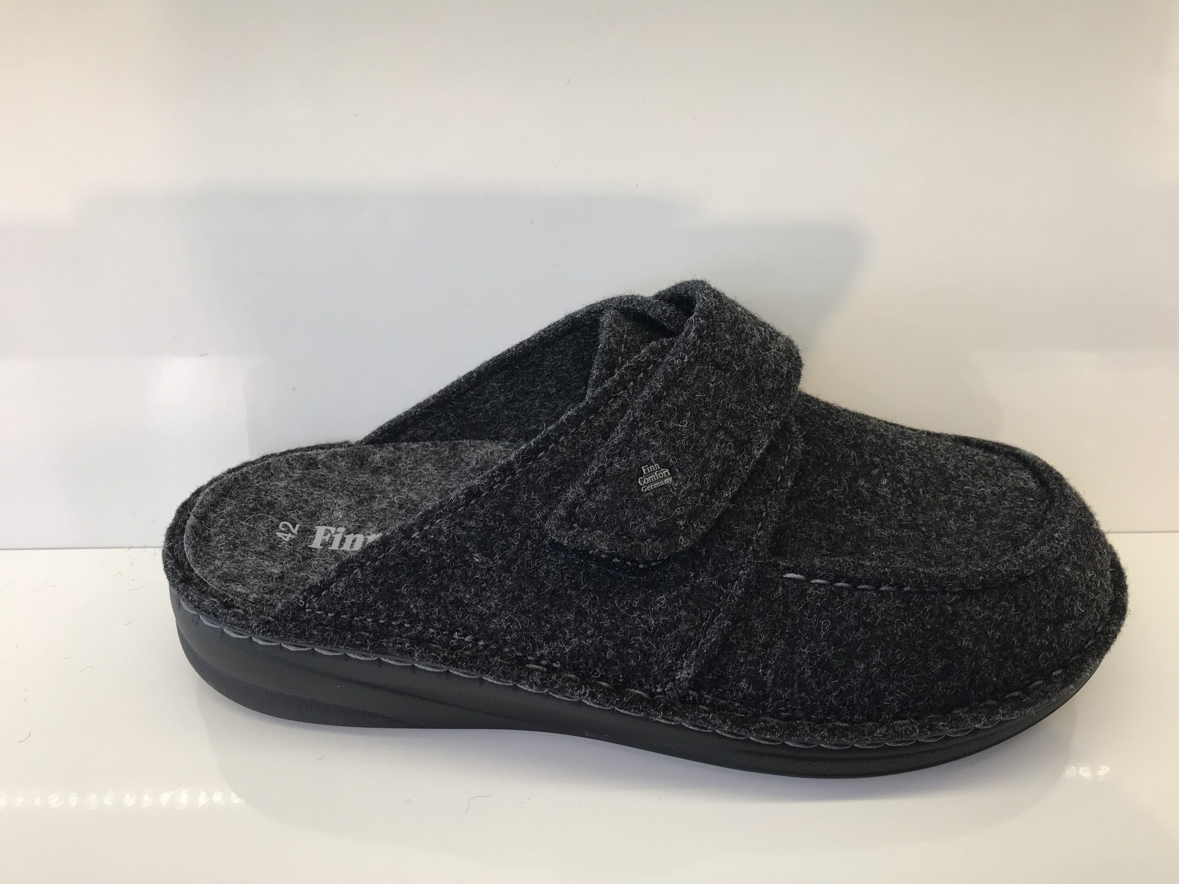 Herrenhausschuhe von Finn Comfort; Obermaterial: 100% Wollfilzmaterial; Innenmaterial: Filzmaterial aus 70% Wolle; herausnehmbares anatomisch geformtes Korkfußbett mit Filzmaterial überzogen; verstellbar durch ein Klettverschluss; Dunkle Sohle PU-Laufsohle; Farbe: Anthrazit