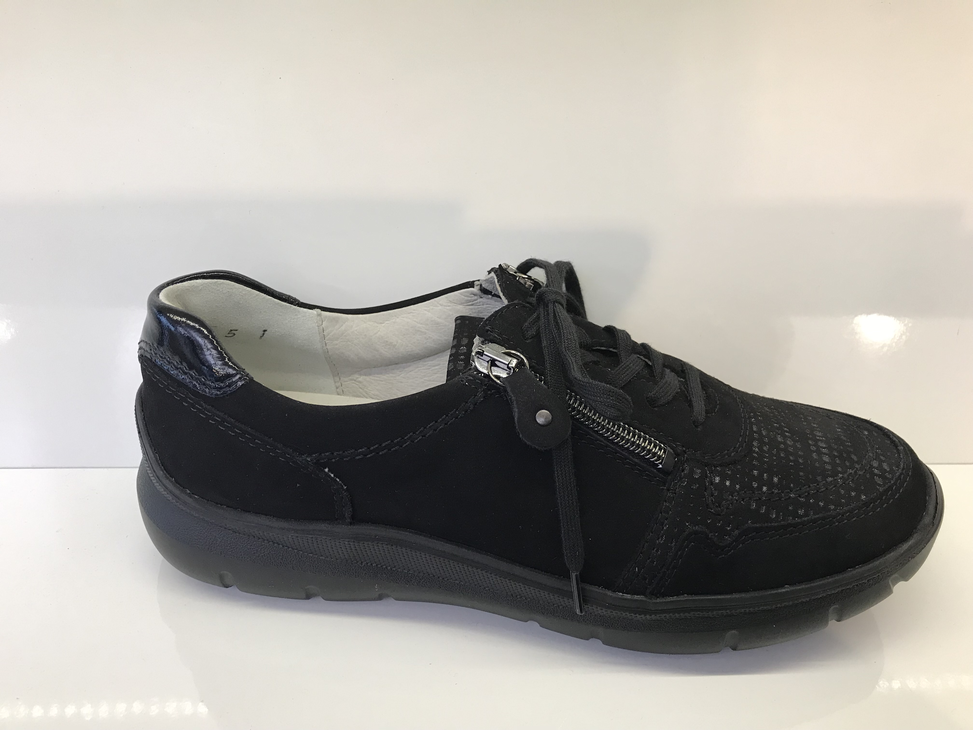 Damenhalbschuhe von Waldläufer; Obermaterial: Nubukleder teils geprägt; Innenmaterial: Leder- und Textilfutter; verstellbar durch Schnürung und einem zusätzlichen Reißverschluss; herausnehmbares Fußbett; PU-Laufsohle; Sehr leicht; Schwarze Sohle; Weite H; Farbe: Schwarz
