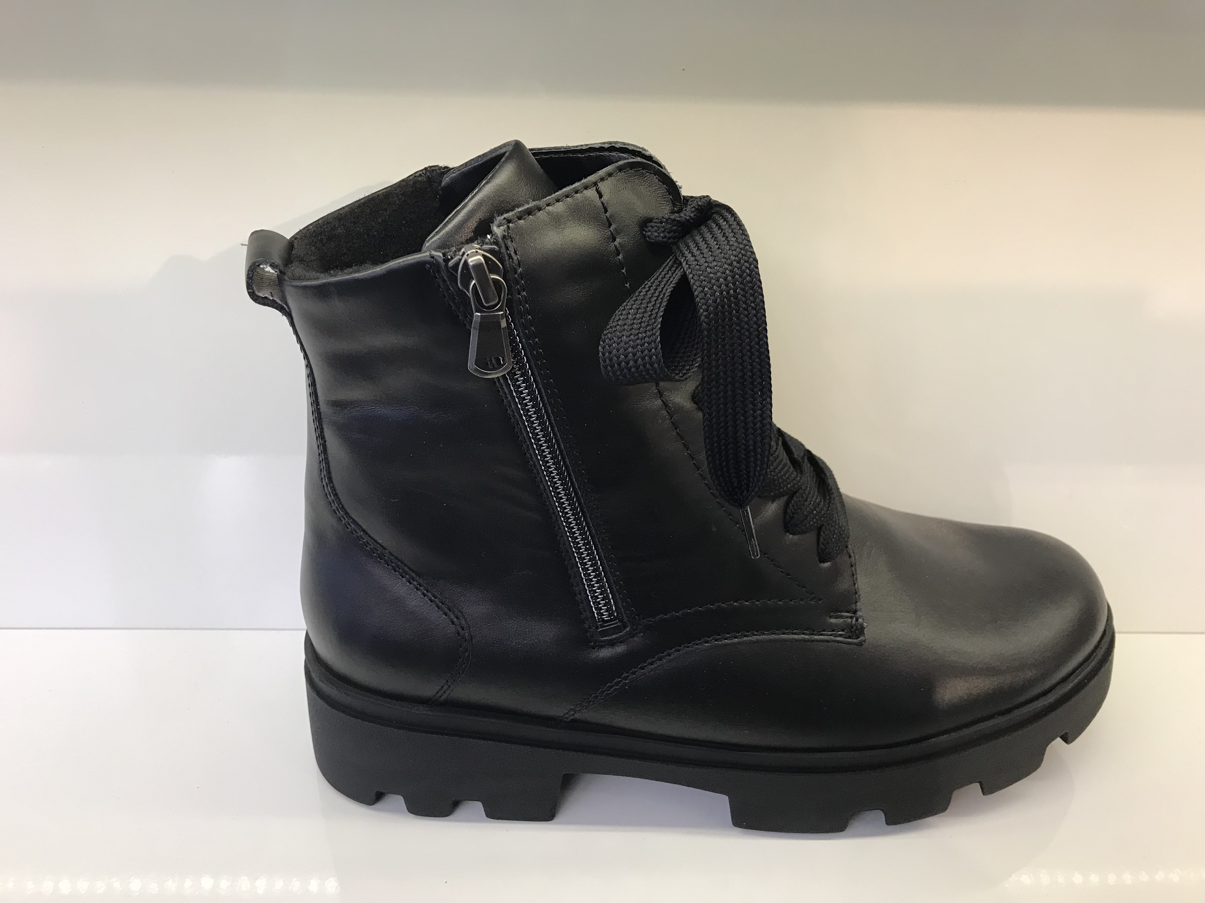 Damenstiefel von Waldläufer; Obermaterial: Glattleder; Innenmaterial: Warmfutter; herausnehmbares Fußbett; verstellbar durch Schnürung und einem Reißverschluss auf der Innenseite; Schwarze Profilsohle; Mit Absatz; Knöchelhoch; Sehr leicht, gutes Profil; Weite K; Farbe: Schwarz