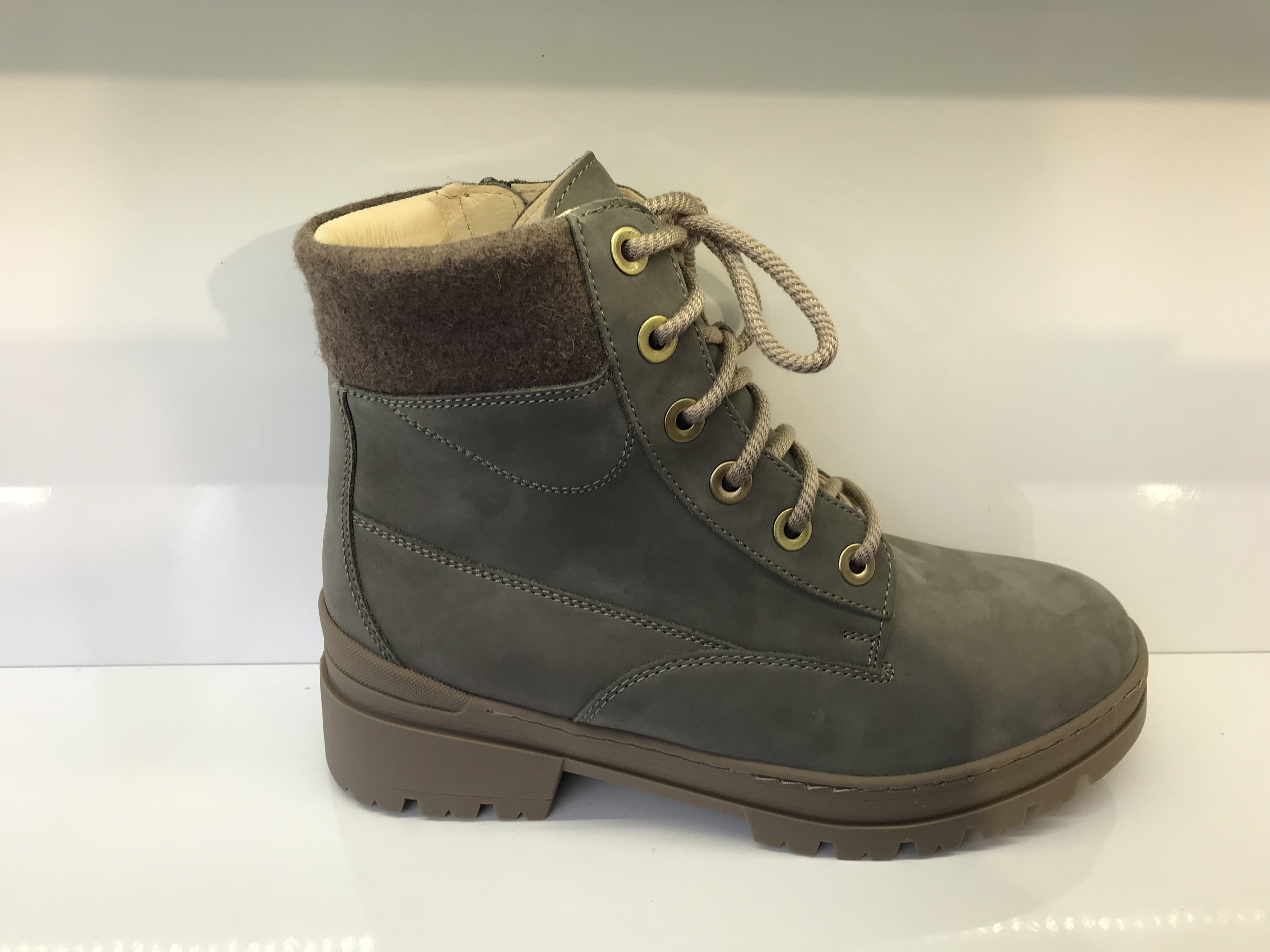 Damenstiefel von Ganter; Obermaterial: Hochwertiges Oilsoftnubukleder; Innenmaterial: Lammfellfutter; herausnehmbares anatomisch geformtes Leichtkorkfußbett; verstellbar durch Schnürung und einem Reißverschluss auf der Innenseite; mit Filzrand am Schaft; rutschfeste Profilsohle; mit Absatz; Helle Sohle; Weite G; Farbe: Khaki