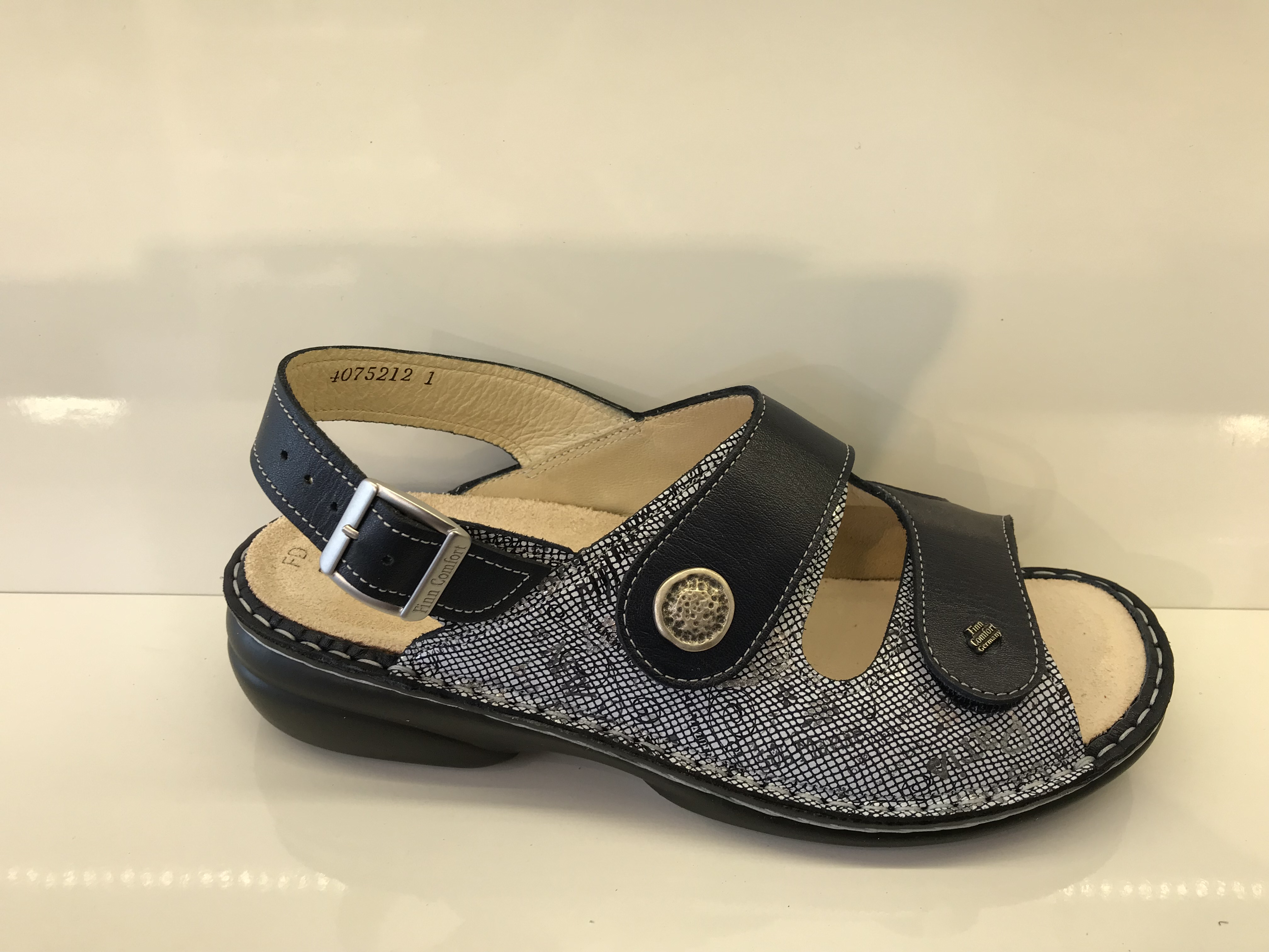 Damensandale von Finn Comfort; Obermaterial: Glattleder mit Strechmaterial für den Hallux; Innenmaterial: Lederfutter; Sohle: PU-Sohle; herausnehmbares Fußbett; verstellbar durch zwei Klettverschlüsse und Fersenriemchen; Form: Isera; Weite D; Farbe: Blue/Atlantic/ Marine / Words