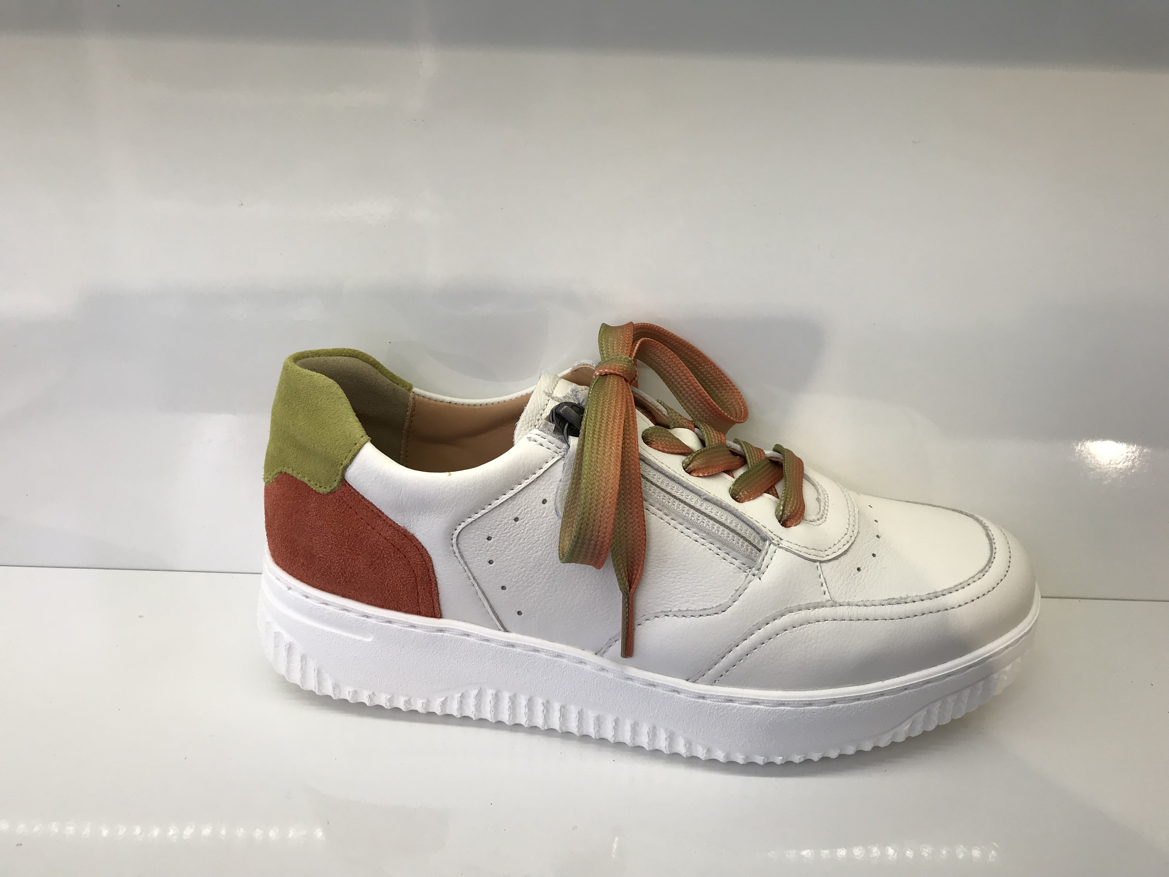 Damenhalbschuhe von Hartjes; Obermaterial: Hochwertiges Lederkombi aus Velour- und Glattleder; Innenmaterial: hochwertiges Lederfutter; verstellbar durch Schnürung und einem seitlichem Reißverschluss; herausnehmbares Leichtkorkfußbett; Machart: gestrobelt; Weiße Sohle; Weite H; Farbe: Weiss-Papaya-Lime